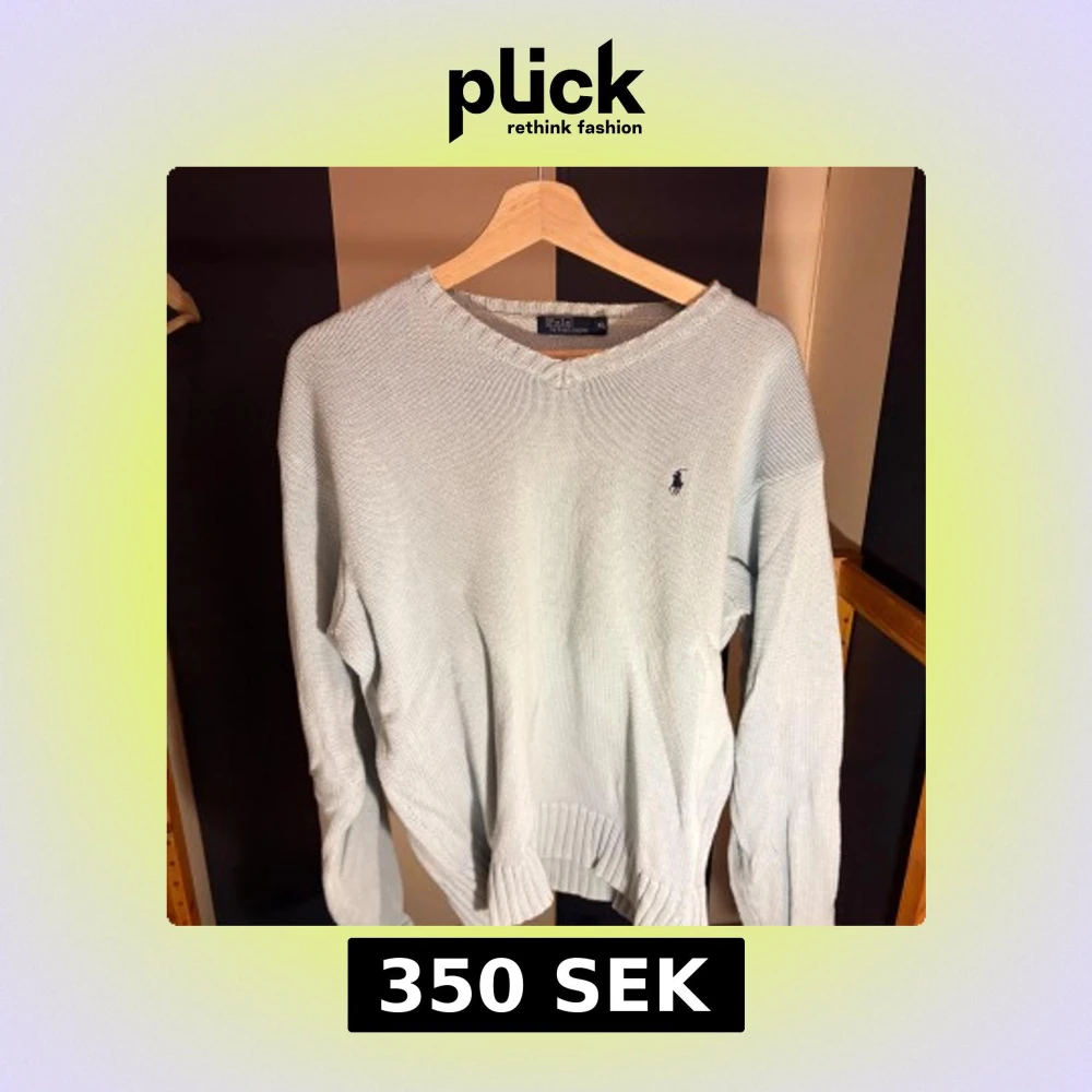 Snygg ljusblå stickad tröja från Polo Ralph Lauren i storlek XL. Tröjan har v-ringad hals, ribbade muddar och den klassiska broderade loggan på bröstet. Perfekt för lager-på-lager och chill stil.