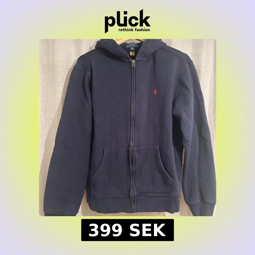 Mörkblå hoodie från Polo Ralph Lauren med dragkedja framtill och klassisk röd broderad logga på bröstet. Tröjan har huva, två fickor och långa ärmar. Perfekt för chill dagar och enkel att matcha med jeans eller joggers.