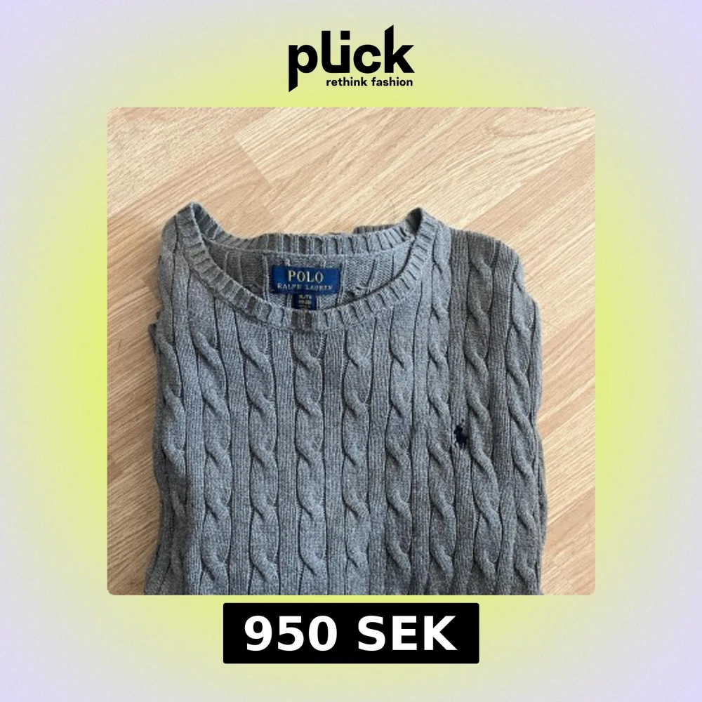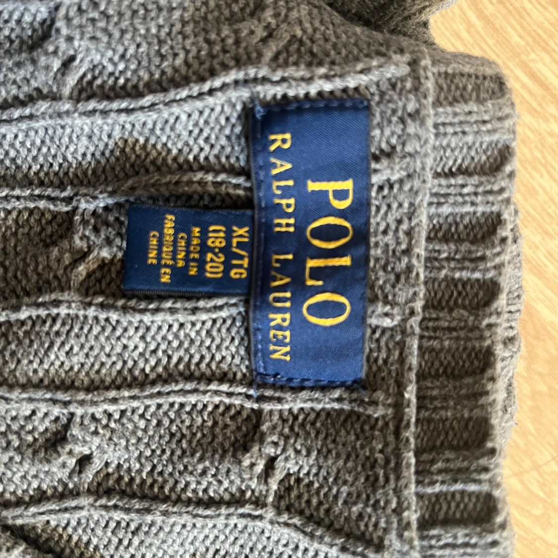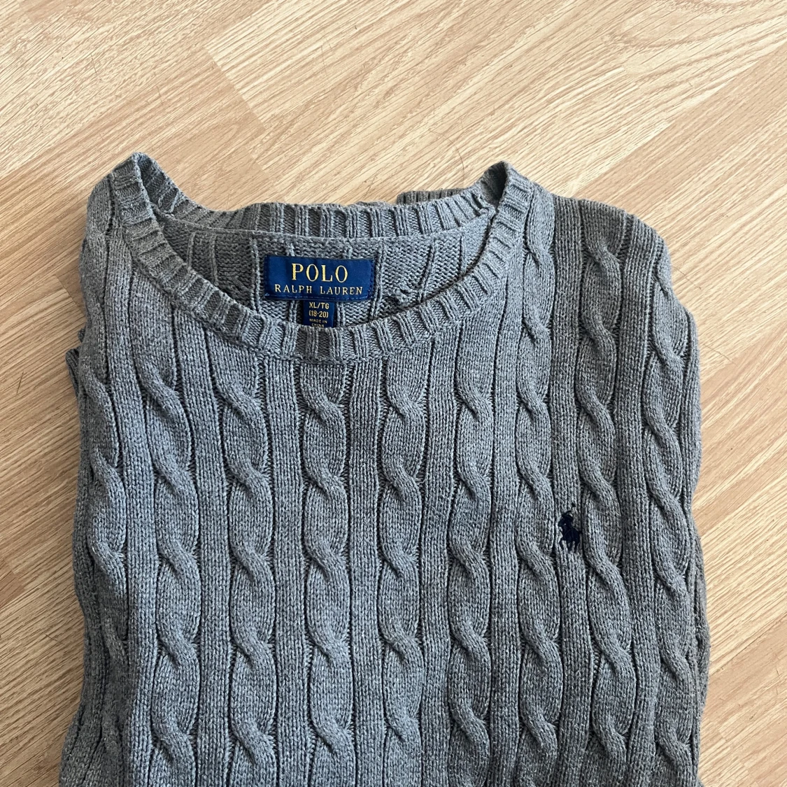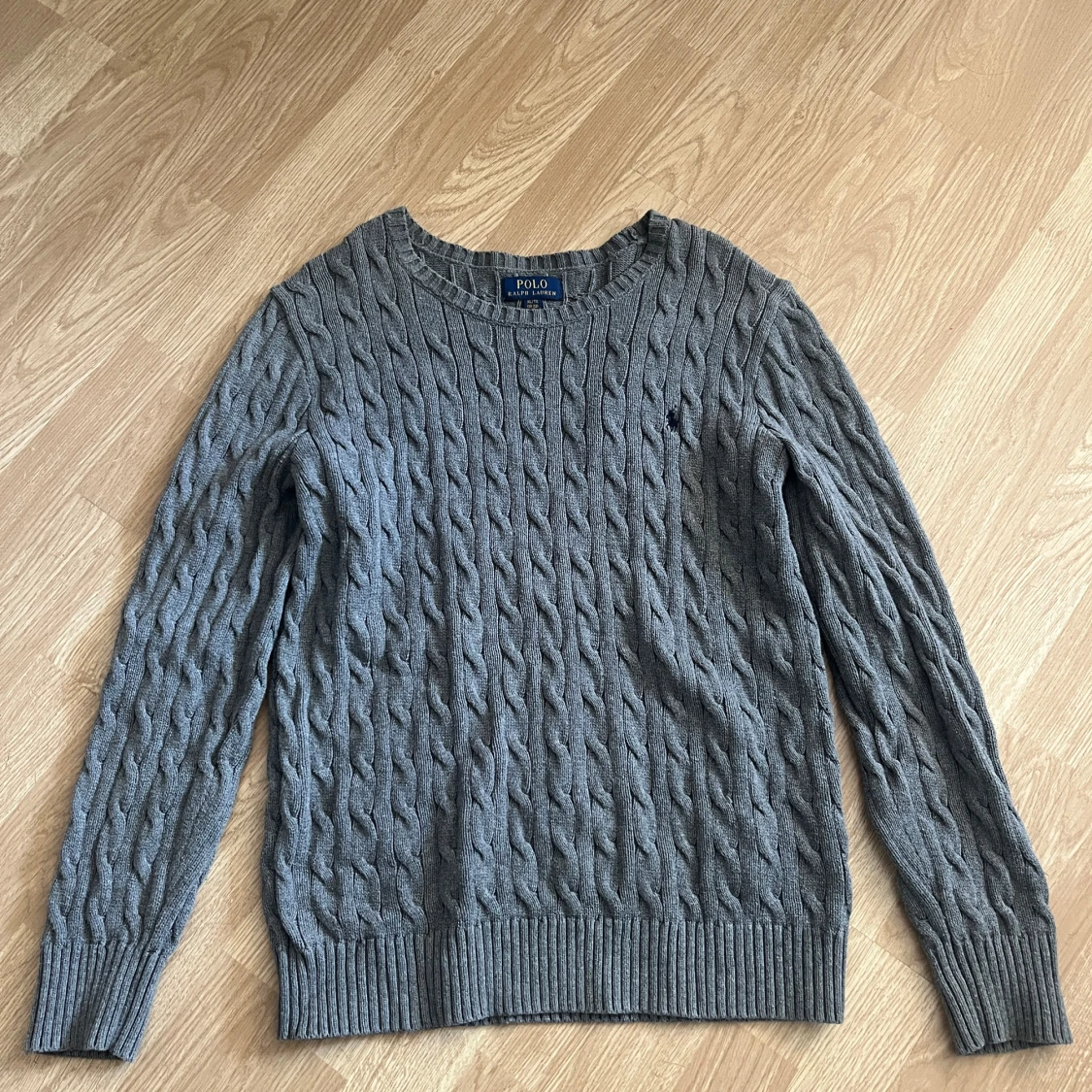 Kabelstickad grå tröja från Polo Ralph Lauren i storlek XL. Klassisk rund halsringning, ribbade muddar och broderad logga på bröstet.