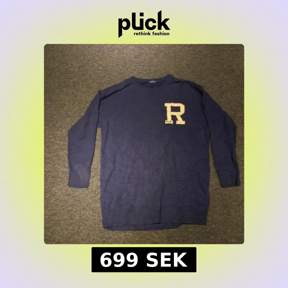 Säljer en mörkblå långärmad tröja från Polo Ralph Lauren med ett stort vitt 'R' broderat på framsidan. Perfekt för en stilren och avslappnad look. Tröjan är i en klassisk design med rund halsringning.
