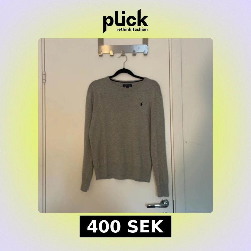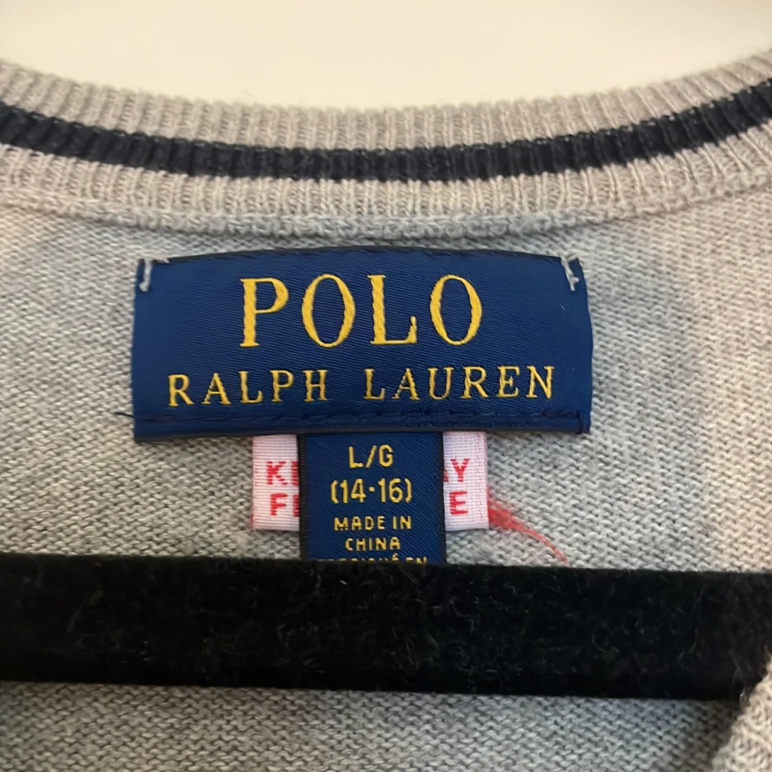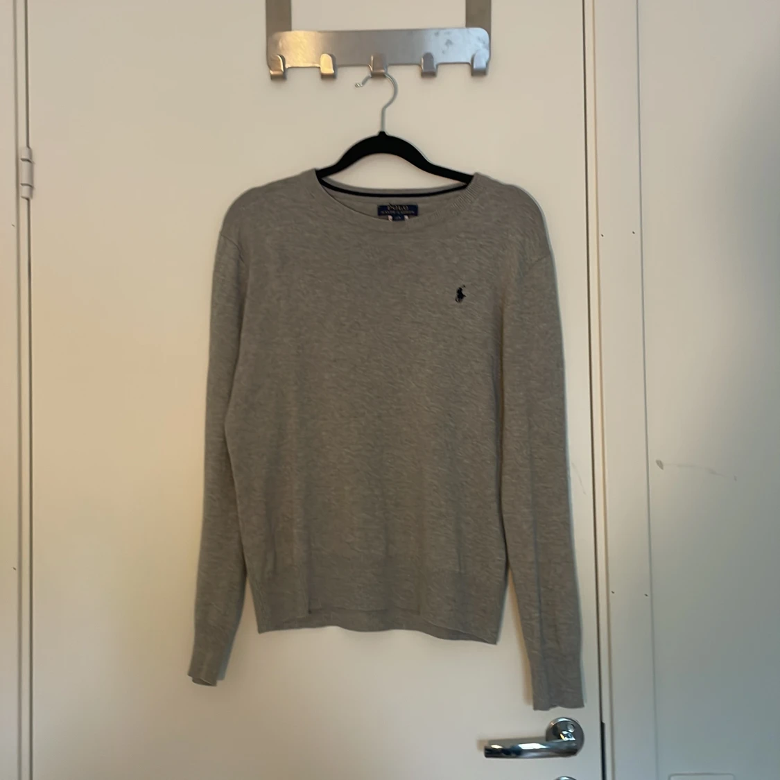 Passar mig som har stolek xs. Snygg grå stickad tröja från Polo Ralph Lauren med klassisk rund hals och mörkblå broderad logga på bröstet. Tröjan har långa ärmar och ribbade muddar vid ärmslut och nederkant. Perfekt för lager-på-lager under hösten och vintern. Använd bara en gång och är helt ny.