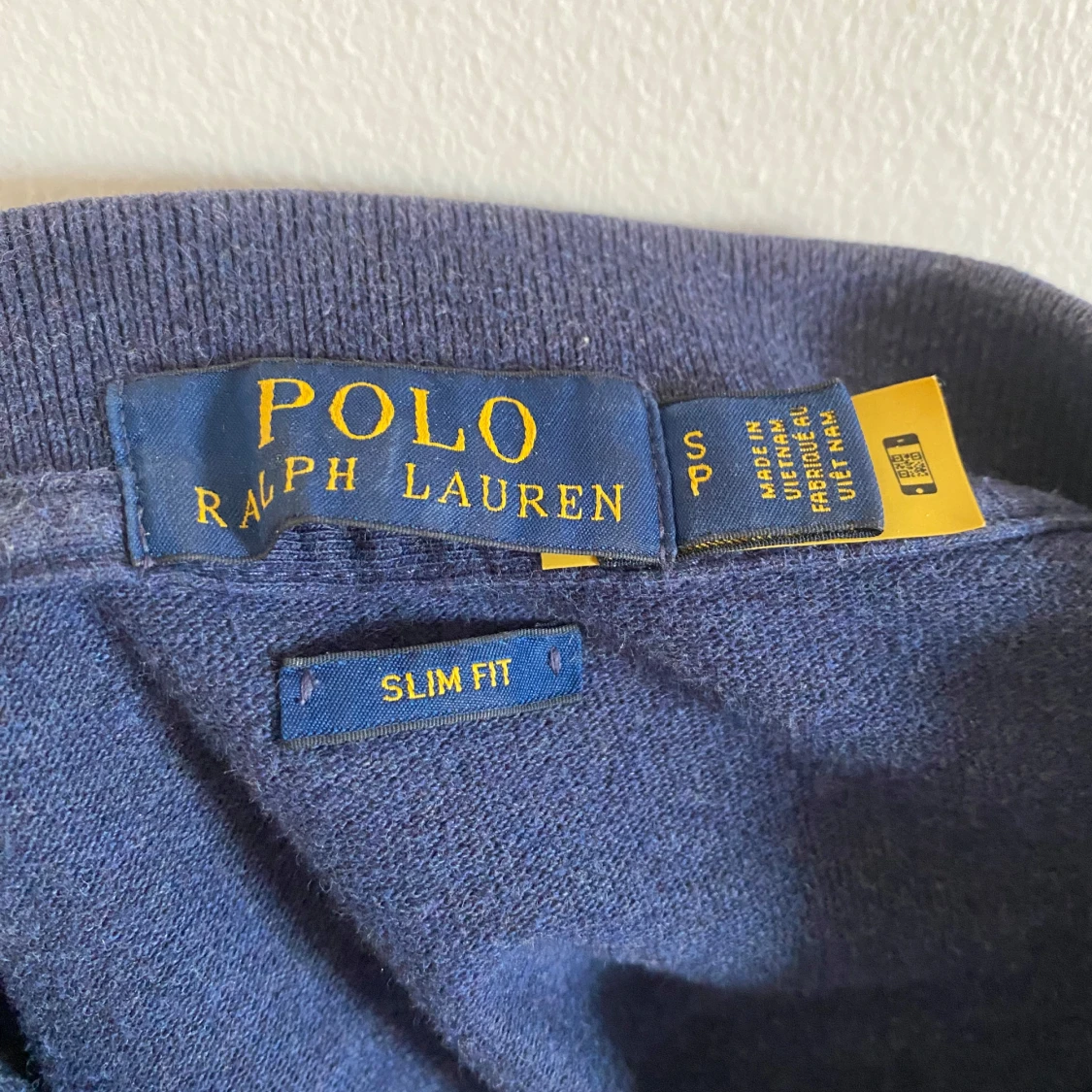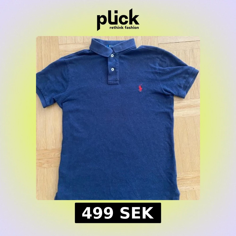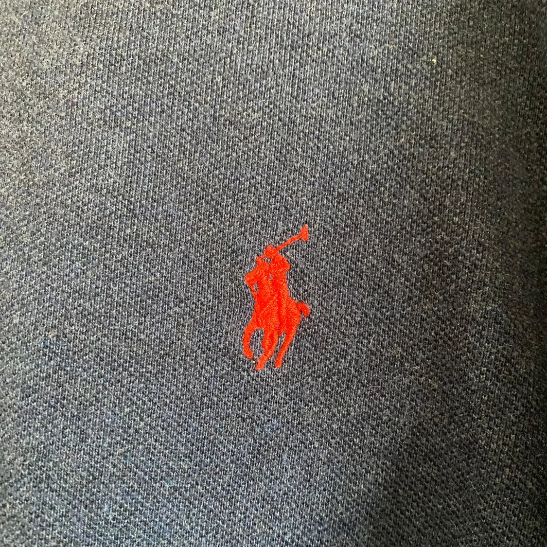 Säljer en stilren blå pikétröja från Ralph Lauren med röd broderad logga på bröstet. Tröjan har korta ärmar och en klassisk krage med två knappar. Perfekt för våren och sommaren.
