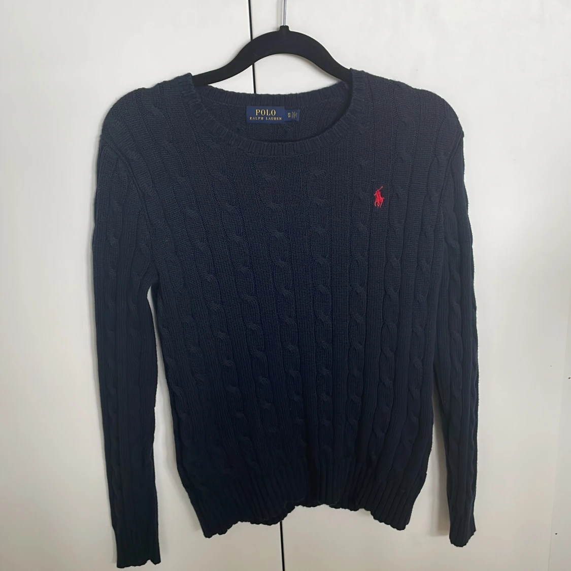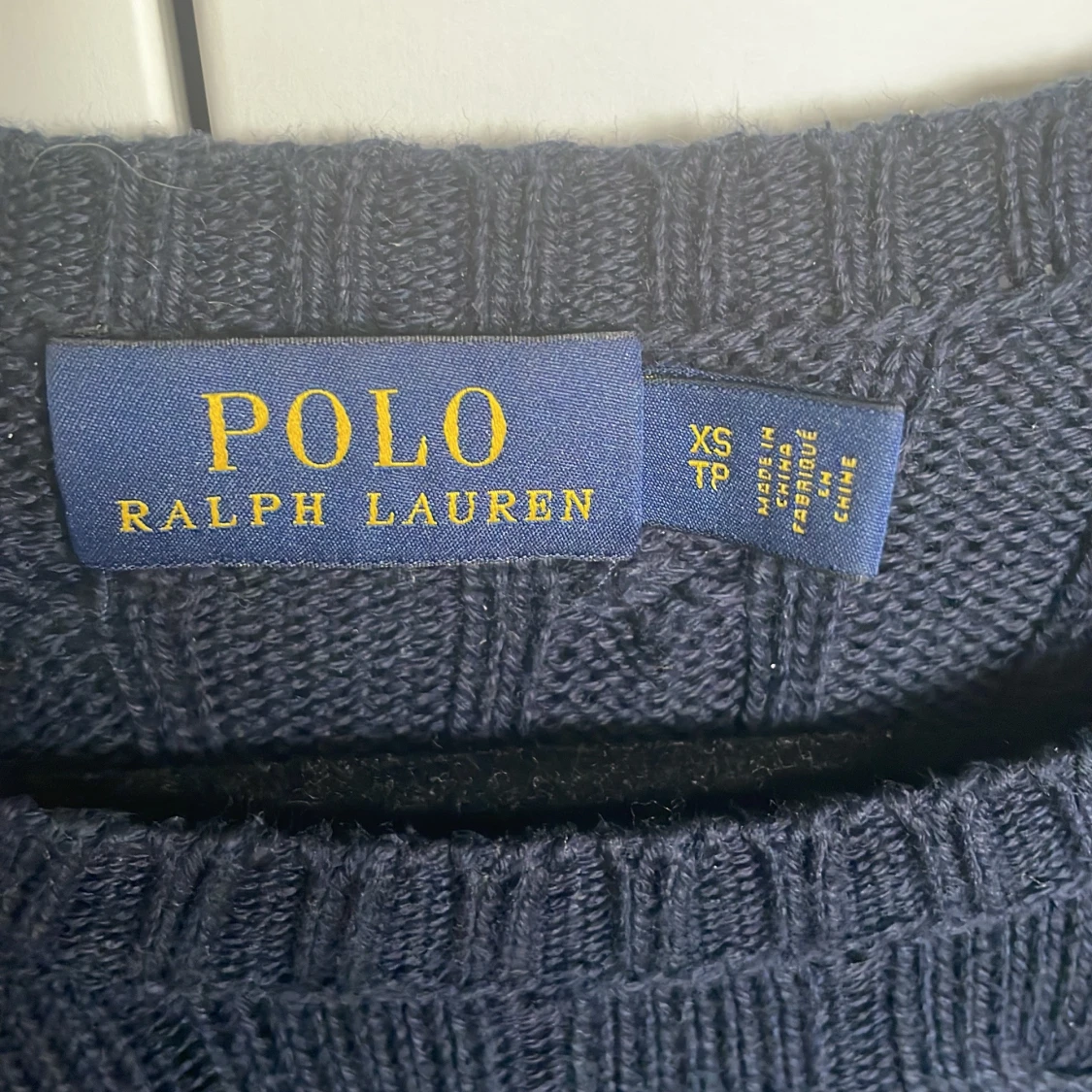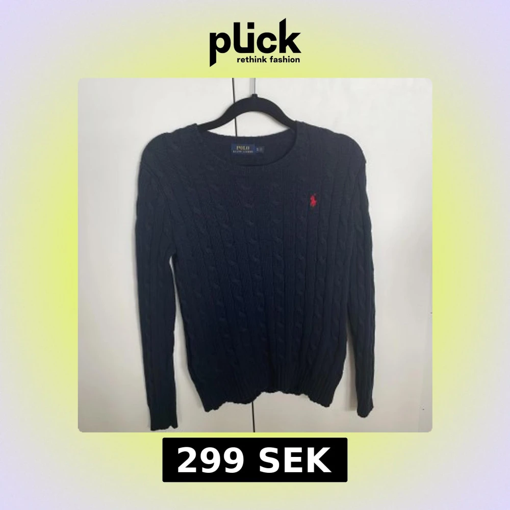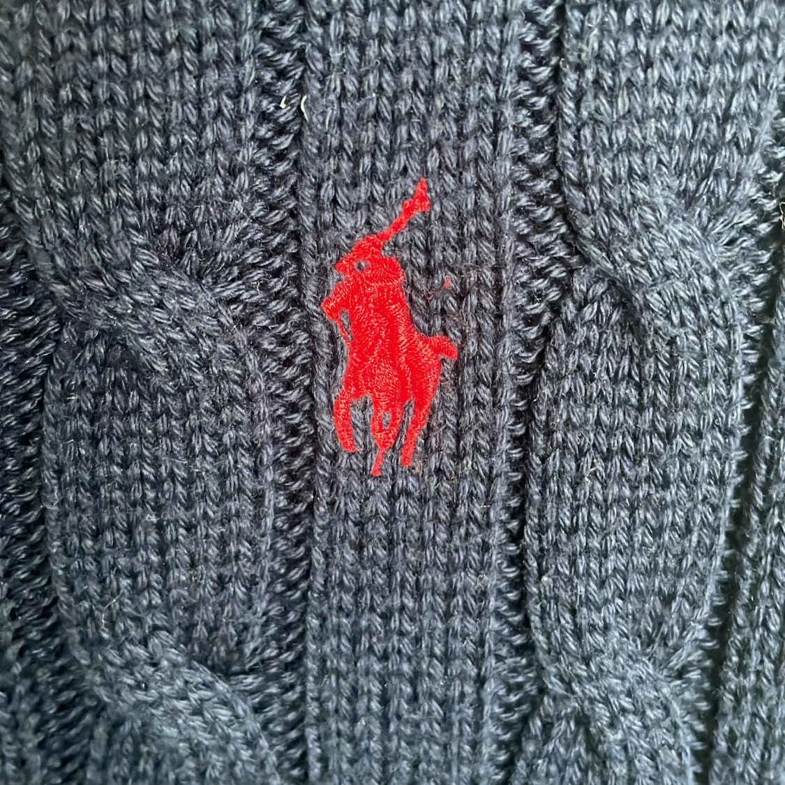 Kabelstickad mörkblå tröja från Ralph Lauren. Fint skick och grym kvalitet! Passar bra till grisch och Stockholmsstilen