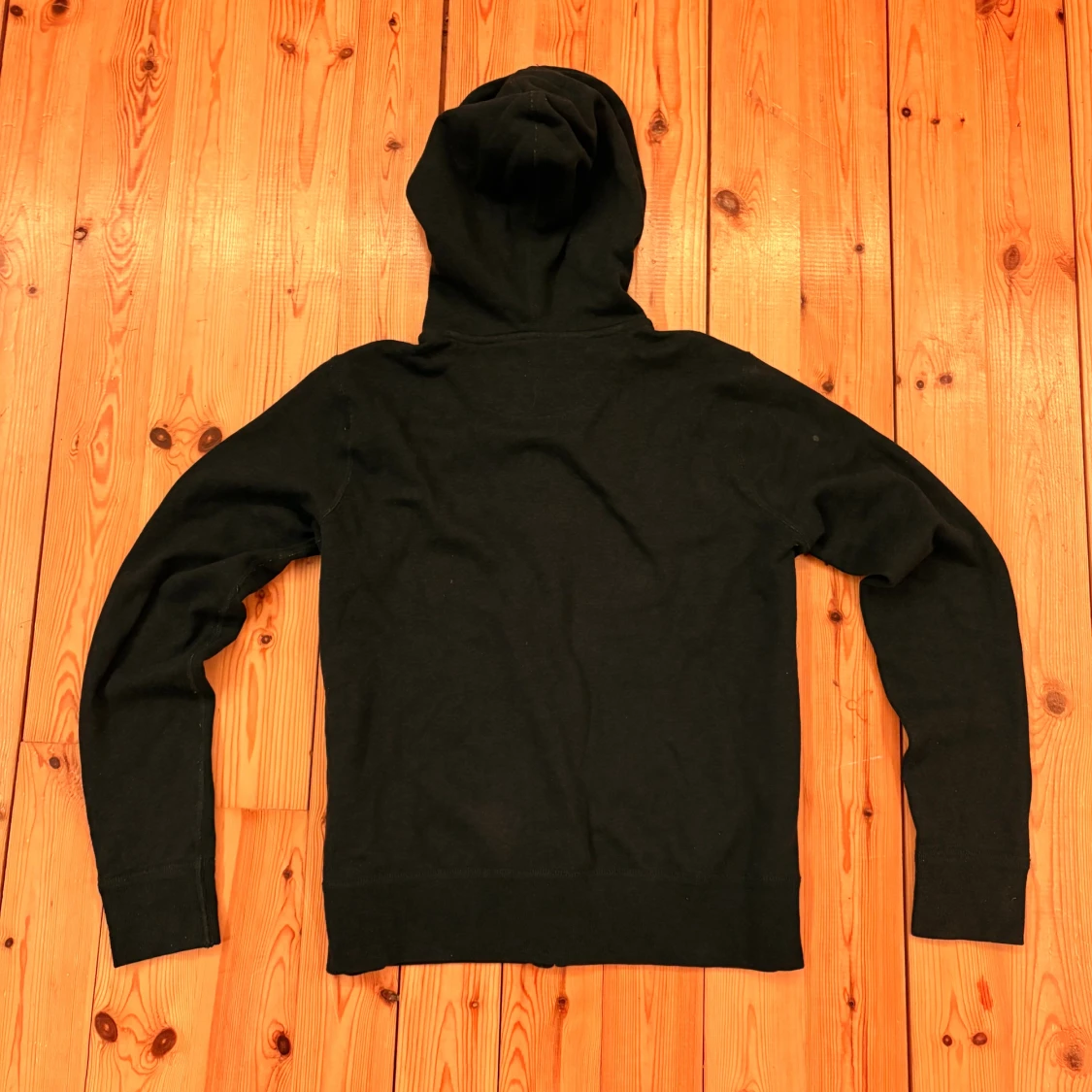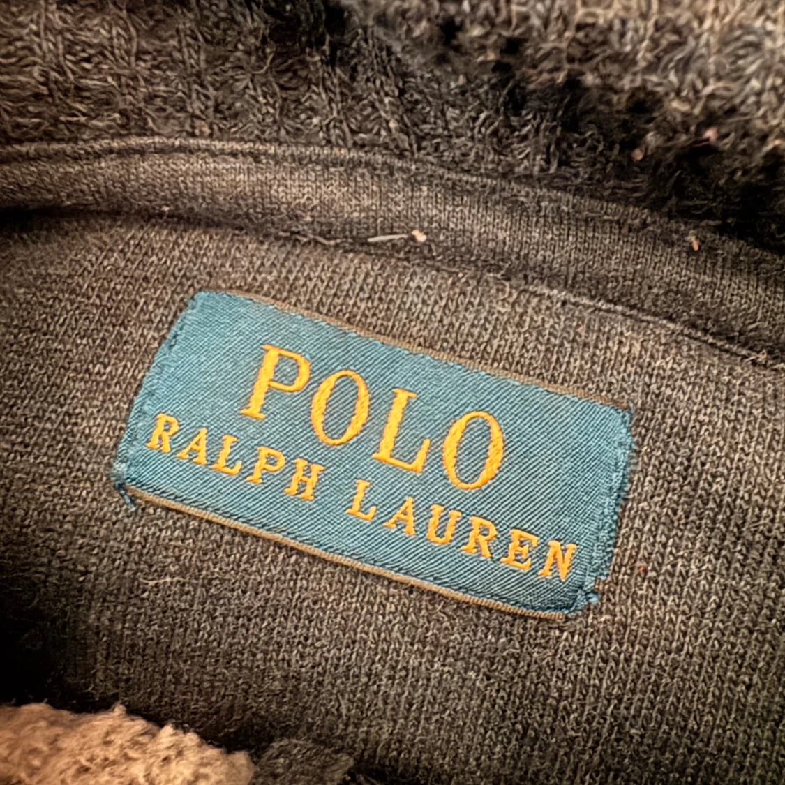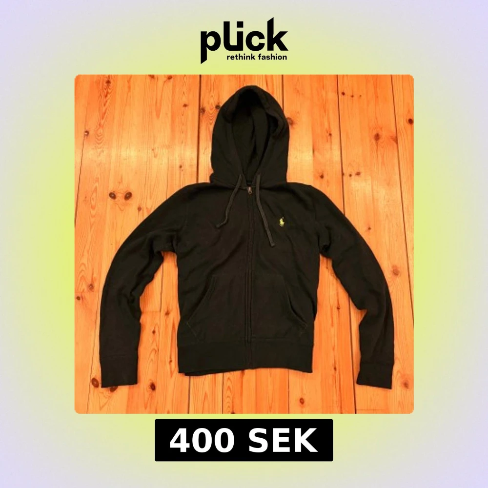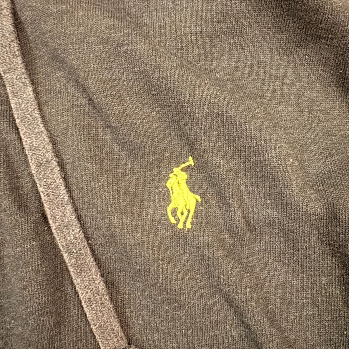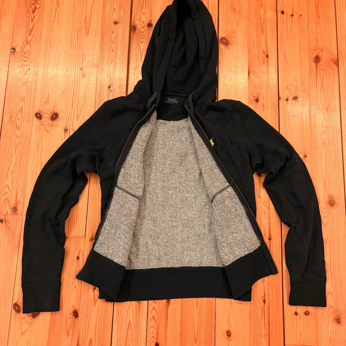 Svart hoodie från Polo Ralph Lauren med dragkedja, huva och snörning. Klassisk gul logga på bröstet och mjuk grå insida. Perfekt för chill dagar och enkel att matcha med jeans eller joggers.