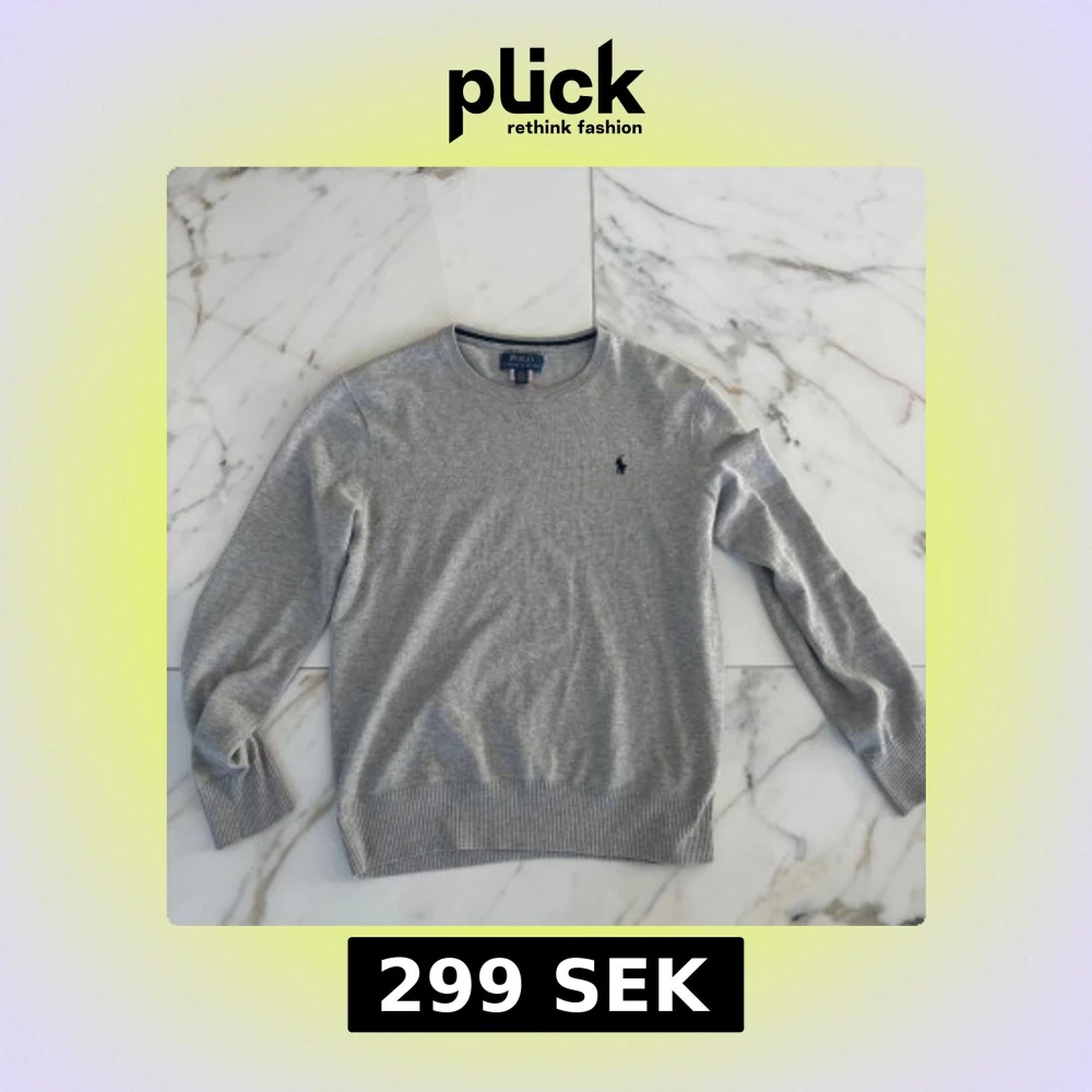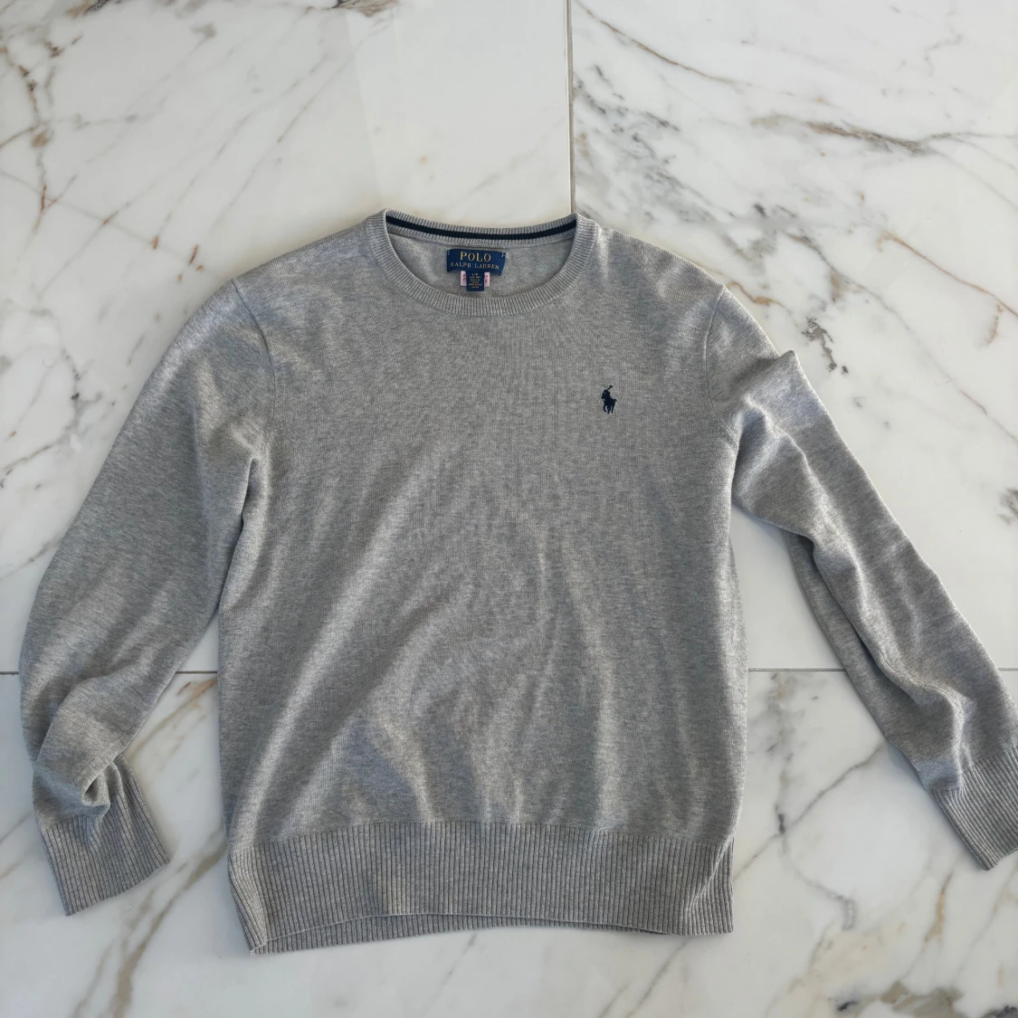 Klassisk grå stickad tröja, Ralph Lauren med rund halsringning och diskret broderad logga på bröstet. Tröjan har ribbade muddar vid ärmslut och nederkant, perfekt för en stilren och enkel look. Storlek: 158-170, (14-16)