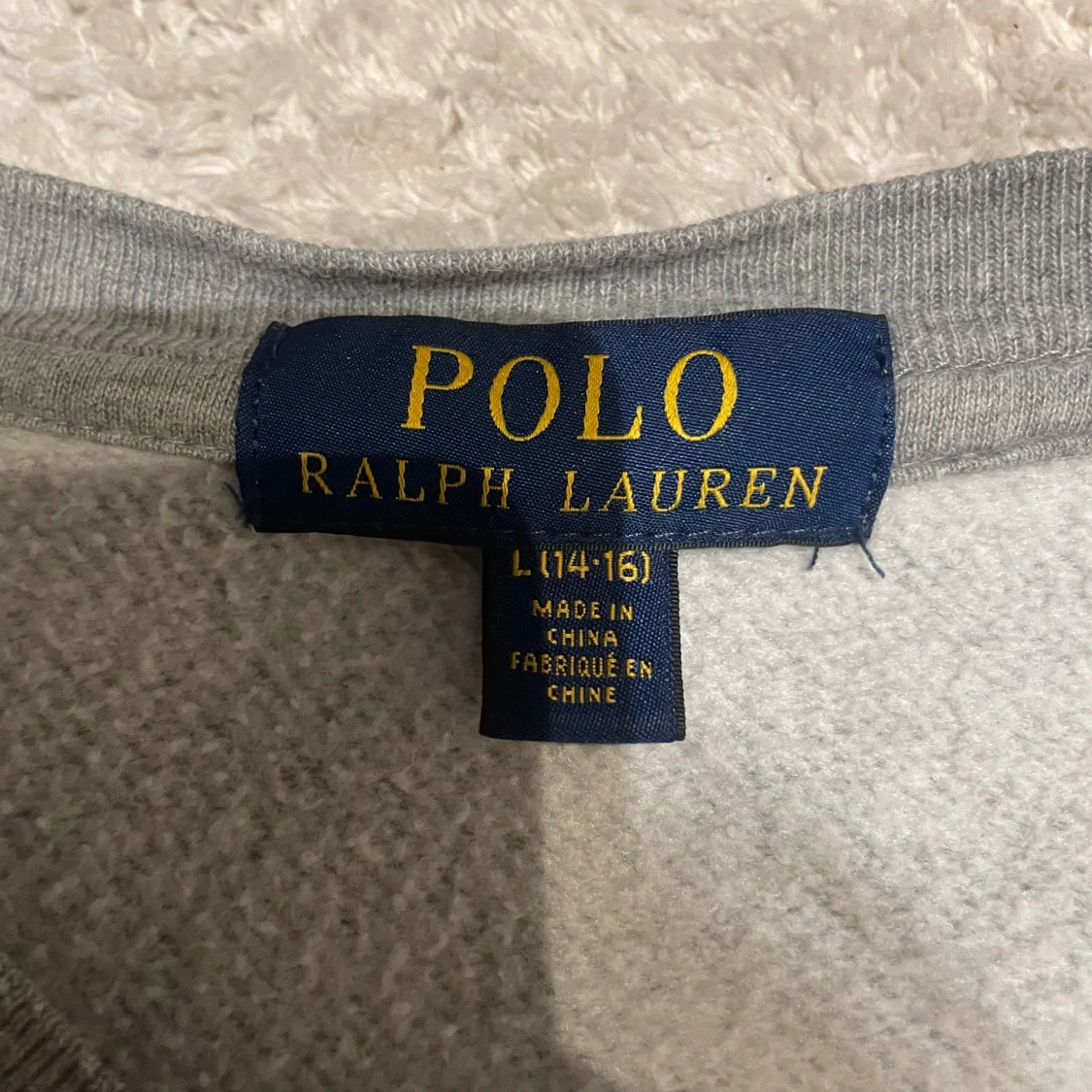 Säljer en stilren grå sweatshirt från Polo Ralph Lauren med det klassiska logotypbroderiet på bröstet. Tröjan har långa ärmar och en rund halsringning, perfekt för en avslappnad look. Passar bra till både jeans och chinos. 15-16