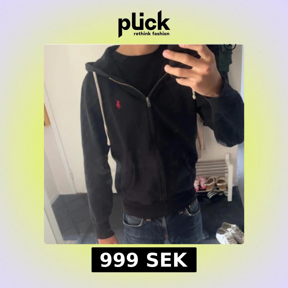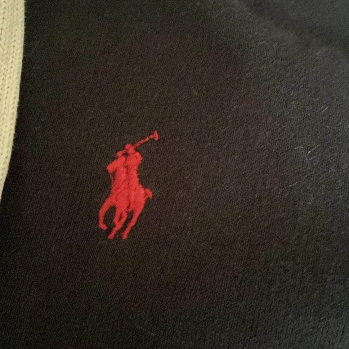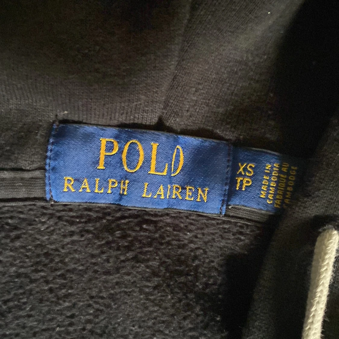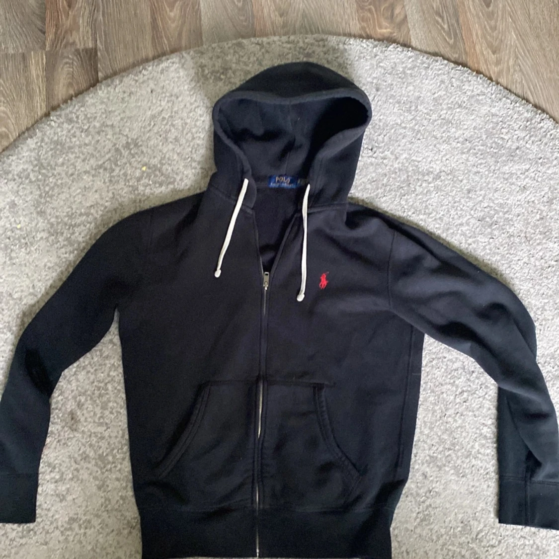 Svart hoodie från Polo Ralph Lauren i storlek XS. Klassisk design med vit snörning i huvan, dragkedja framtill och röd broderad logga på bröstet. Mjuk bomullskänsla och känguruficka framtill. Perfekt för en chill och stilren look.