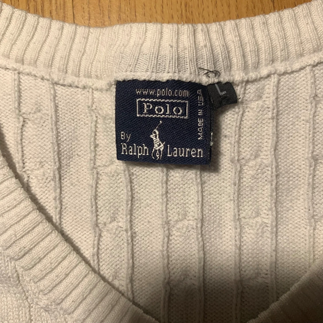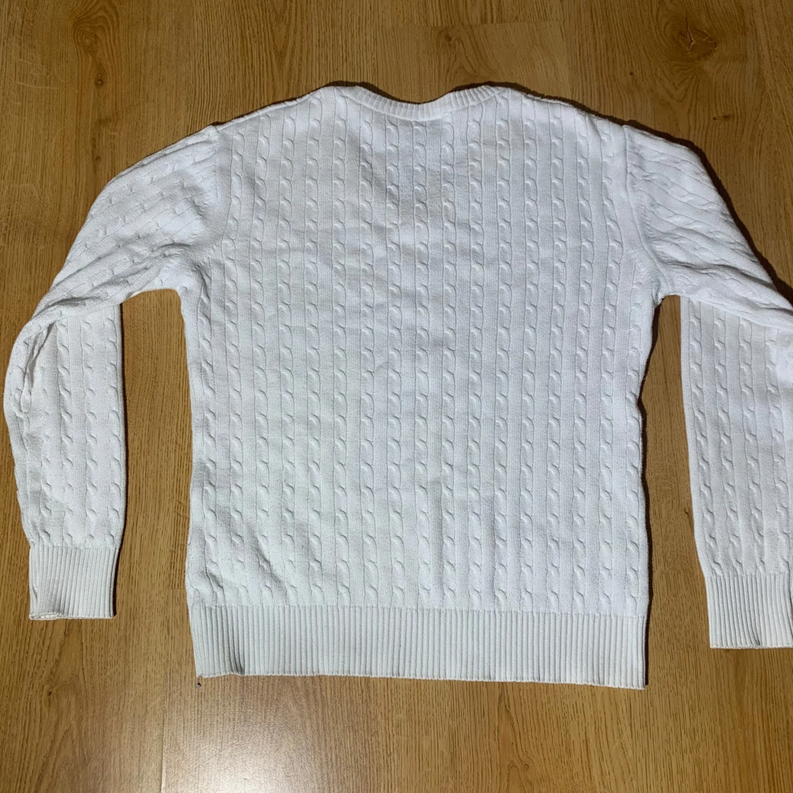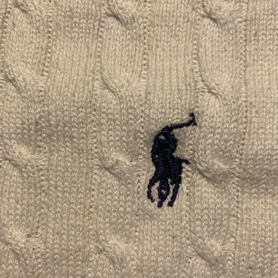 Säljer en stilren vit stickad tröja från Ralph Lauren med klassiskt kabelstickat mönster. Tröjan har en v-ringad hals och långa ärmar. Den ikoniska loggan är broderad på bröstet i marinblått. Perfekt för en elegant och avslappnad stil. Storlek L men passar dig om du är 150-164 så S eller Xs