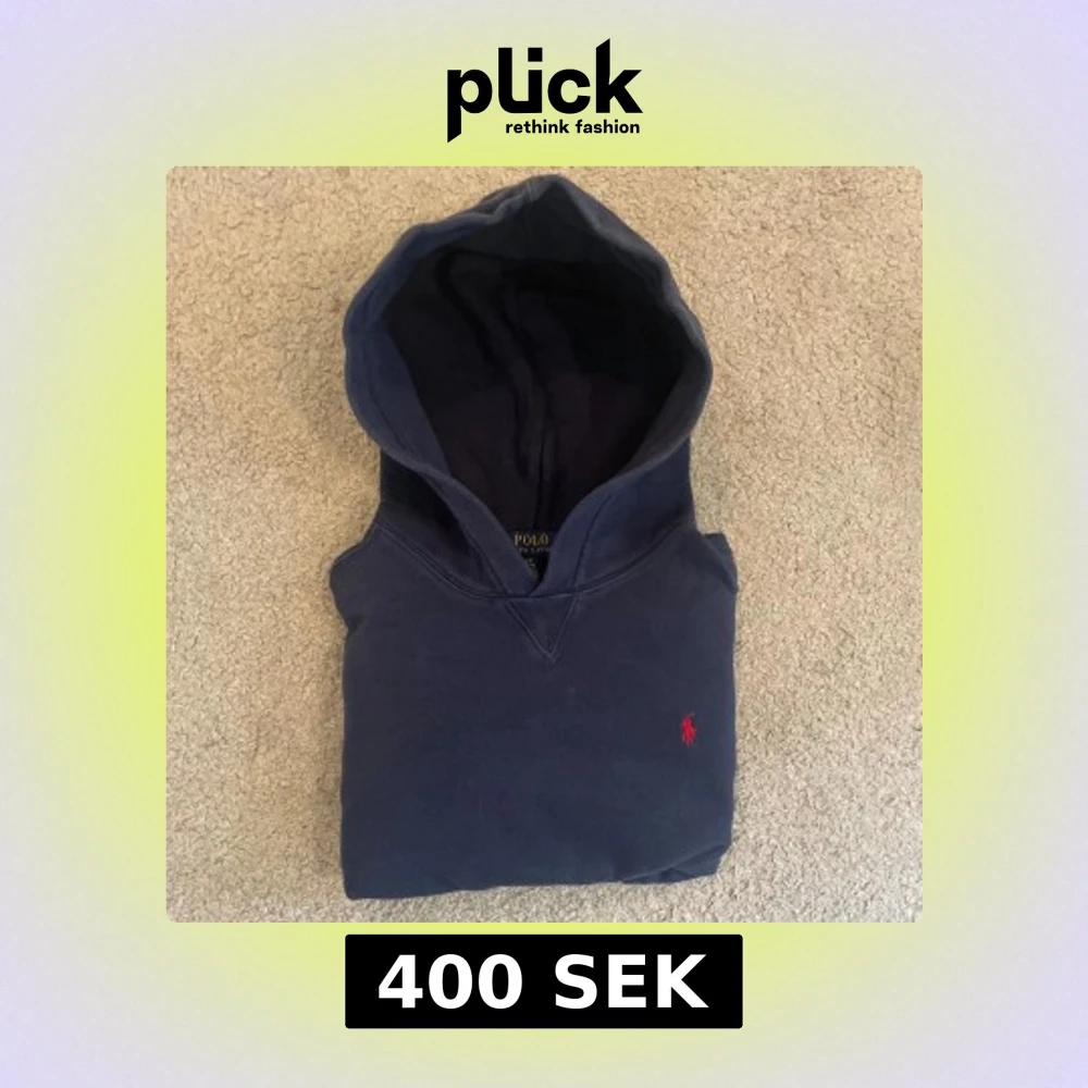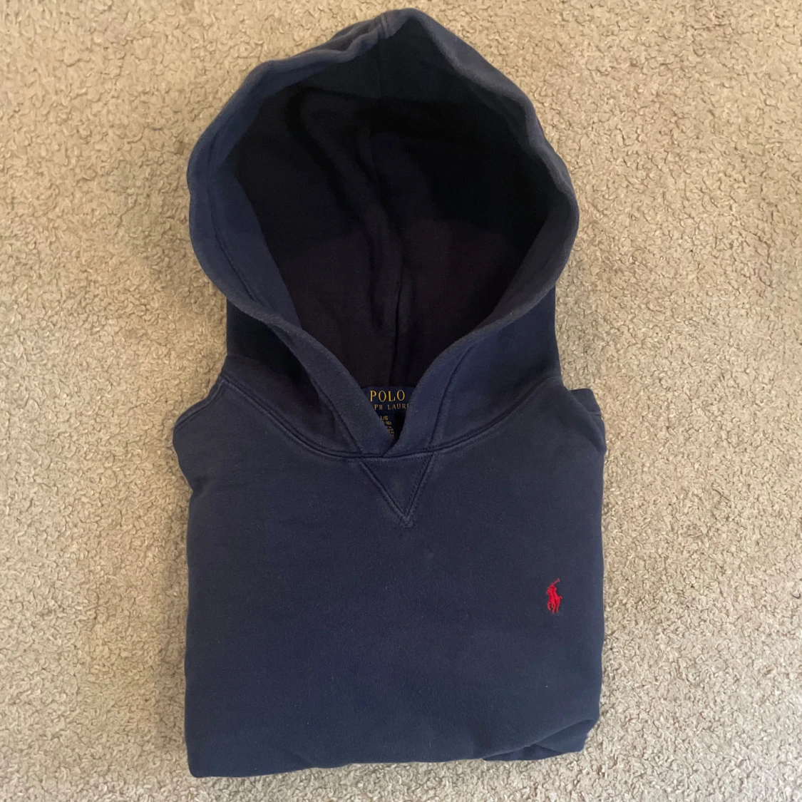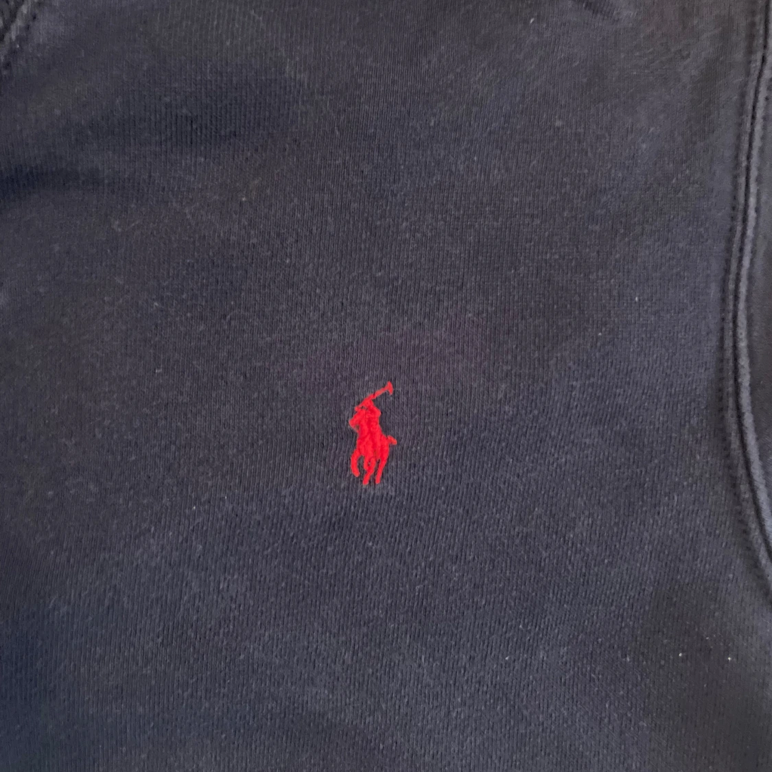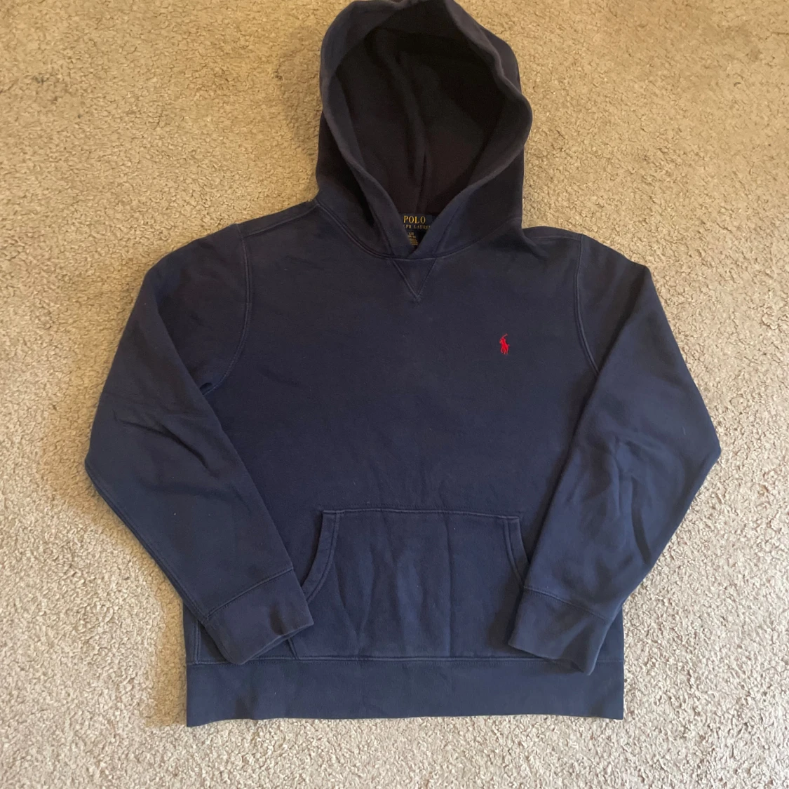 Säljer en marinblå hoodie från Polo Ralph Lauren med klassisk röd broderad logga på bröstet. Tröjan har huva, känguruficka och är tillverkad i mjuk bomull. Perfekt för chill dagar och snygg till jeans eller joggers.