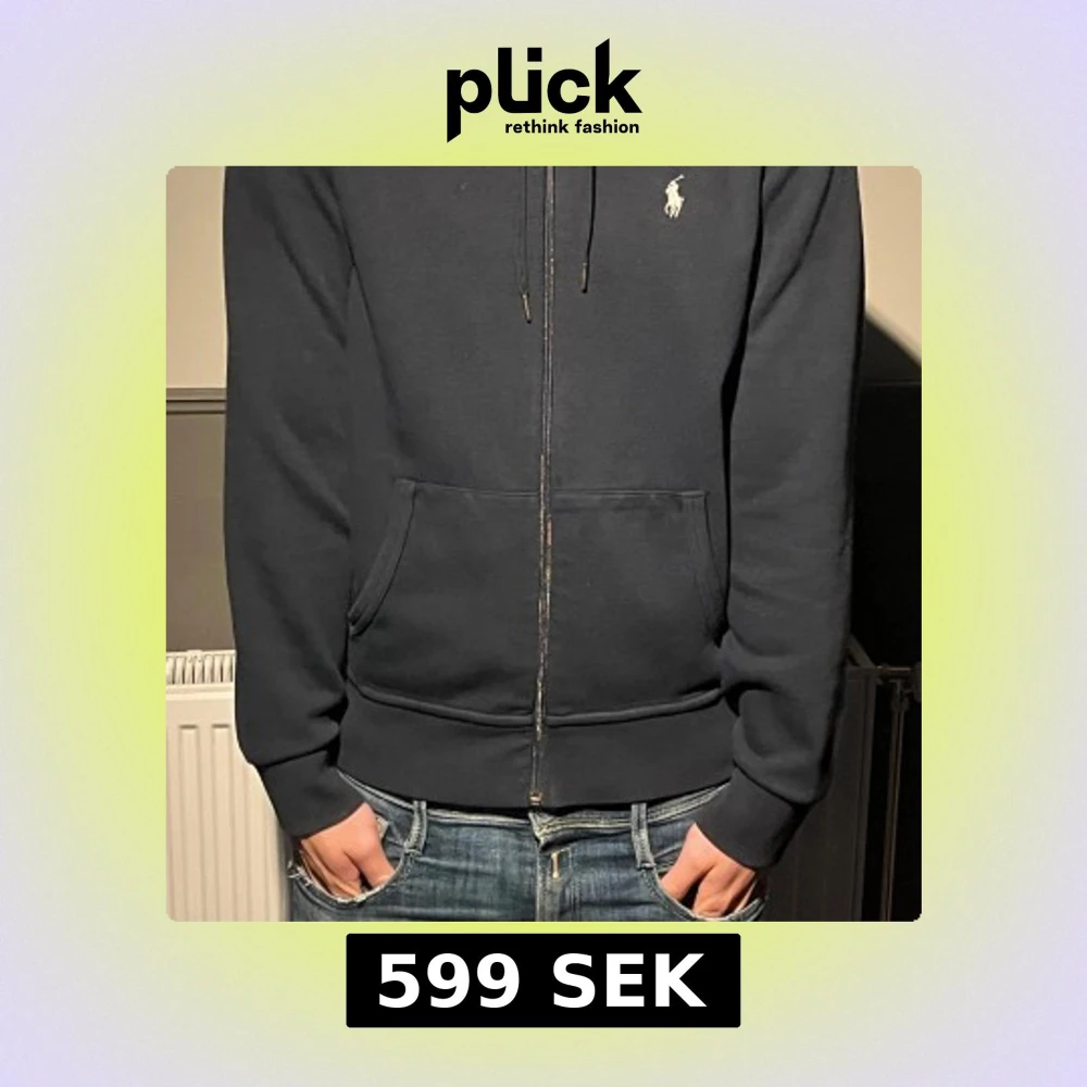 Mörkblå hoodie från Ralph Lauren med dragkedja, huva och snörning. Klassisk logga broderad på bröstet och känguruficka framtill. Skön passform och perfekt för chill dagar. Materialet känns mjukt och är troligtvis bomull eller bomullsblandning. Äkta såklart!