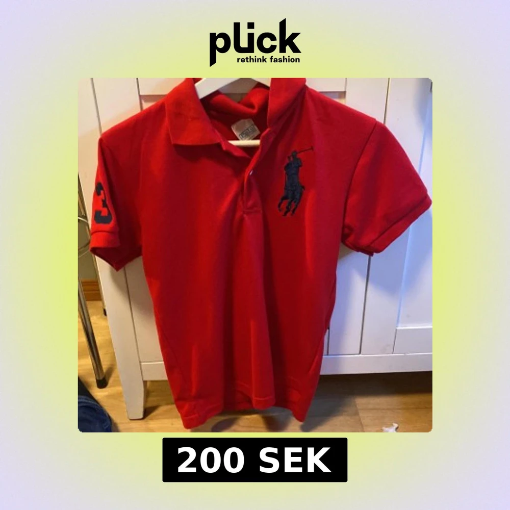 Snygg röd pikétröja från Ralph Lauren med en stor broderad logga i marinblått på bröstet och siffran 3 på ärmen. Perfekt för en stilren och sportig look.