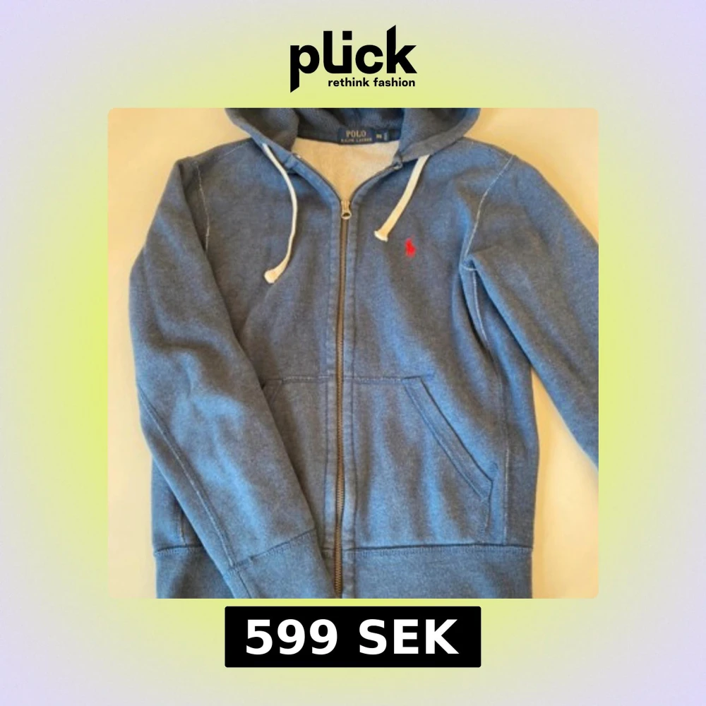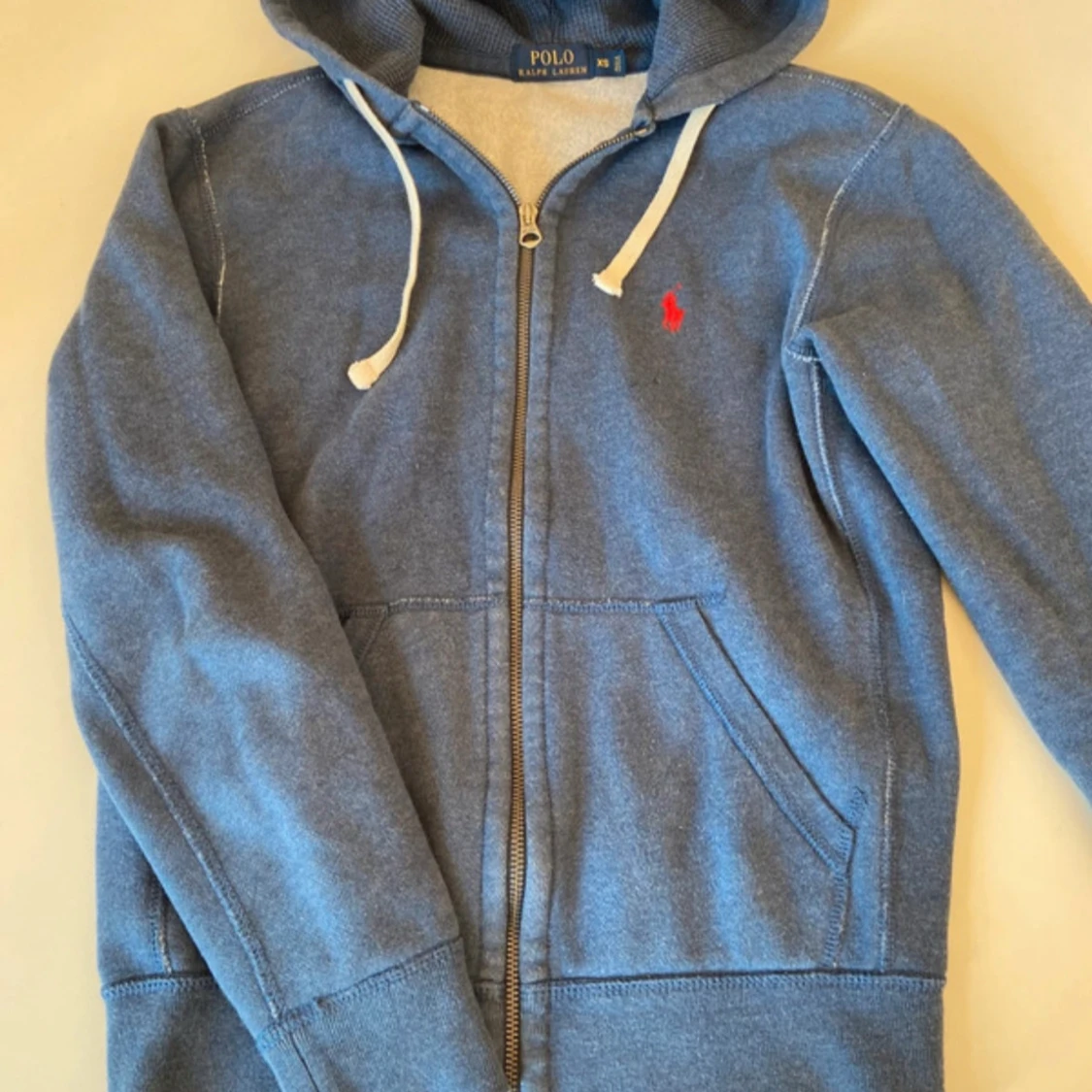 Blå hoodie från Polo Ralph Lauren med dragkedja, huva med vita snören och klassisk röd logga på bröstet. Mjuk insida och kängurufickor framtill. Perfekt för en chill och stilren look.