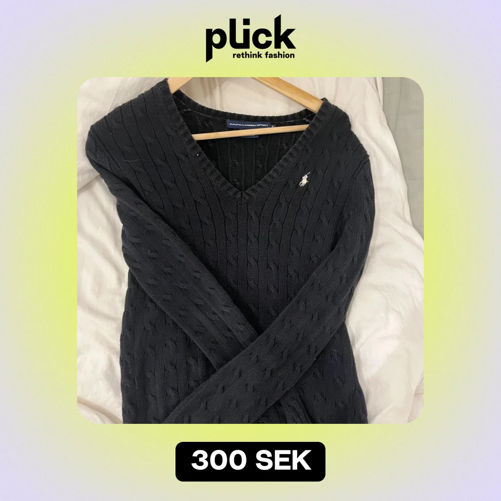 Säljer en snygg svart stickad tröja från Ralph Lauren med v-ringning och deras ikoniska logga på bröstet. Perfekt för både höst och vinter, den är både stilren och bekväm. Passar till alla tillfällen, från skola till middag med vänner. 🖤