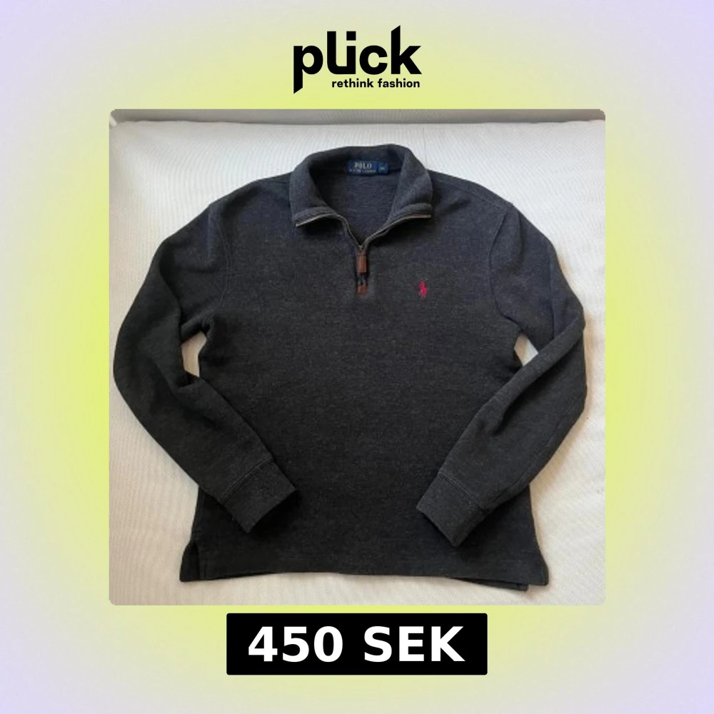 Mörkgrå långärmad tröja från Polo Ralph Lauren i storlek XS. Klassisk halv dragkedja med läderdetalj och broderad rosa logga på bröstet. Skön passform och mjukt material, perfekt till lager-på-lager-stil.