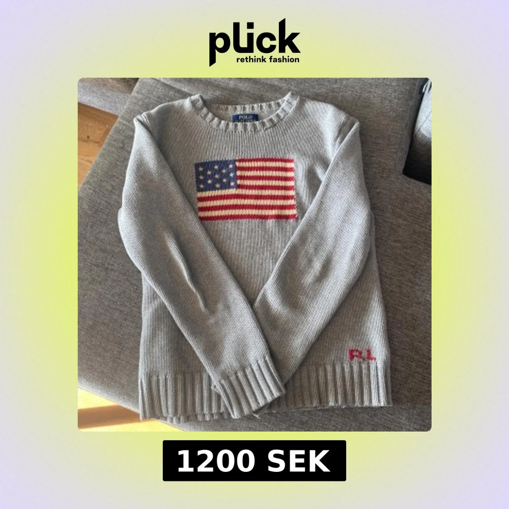 Säljer en stilren grå stickad tröja från Ralph Lauren med ett amerikanskt flaggmotiv på framsidan. Tröjan har långa ärmar och ribbade kanter vid hals, ärmslut och nederkant. Perfekt för en avslappnad och trendig look.