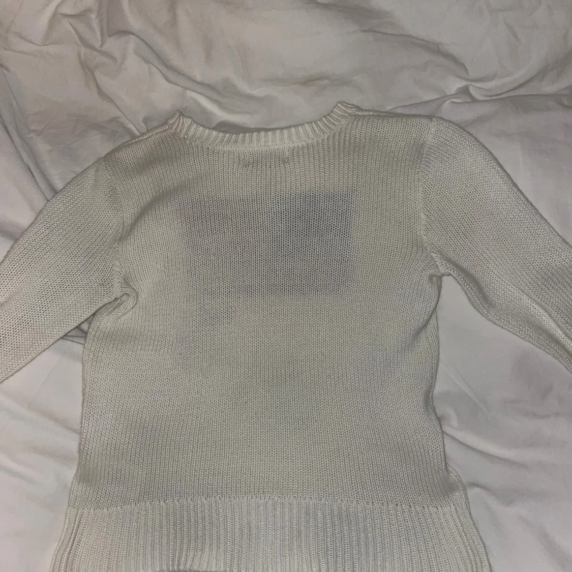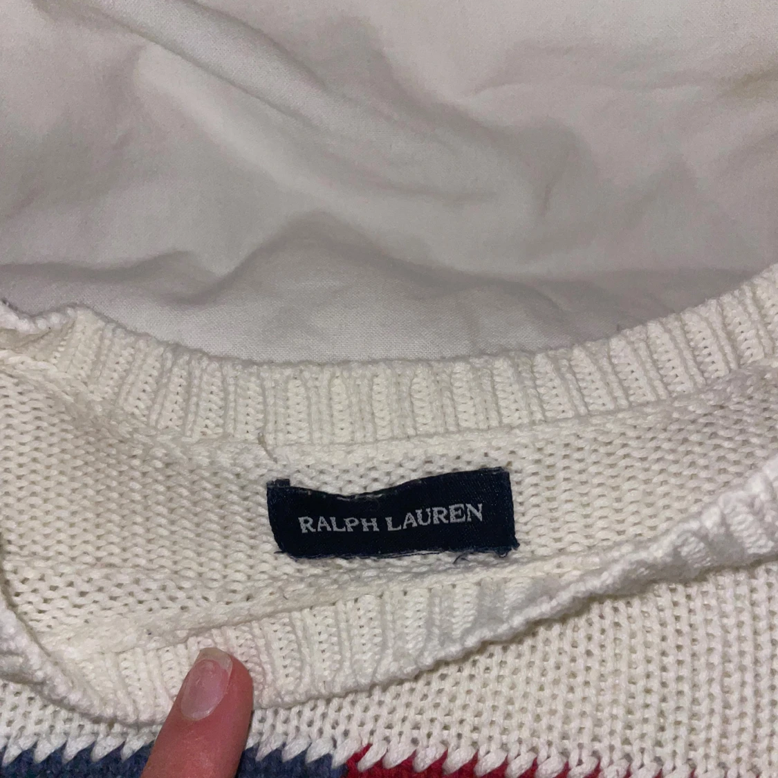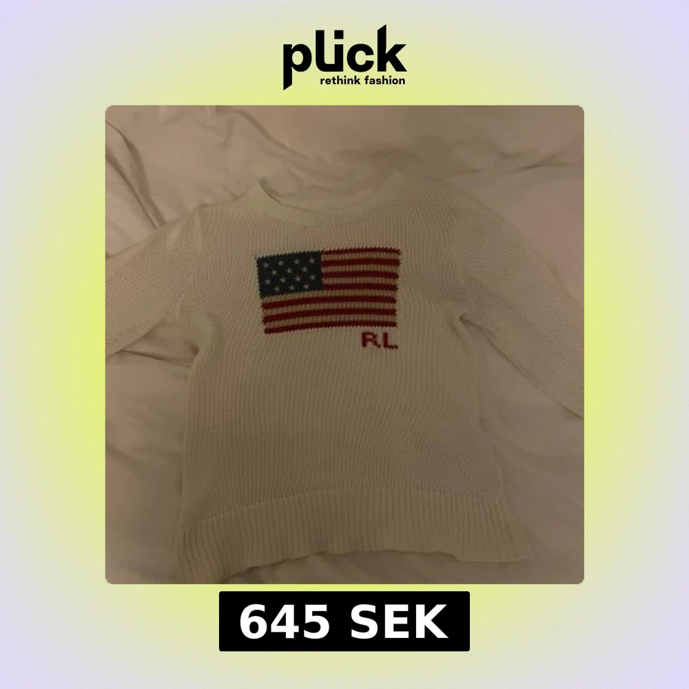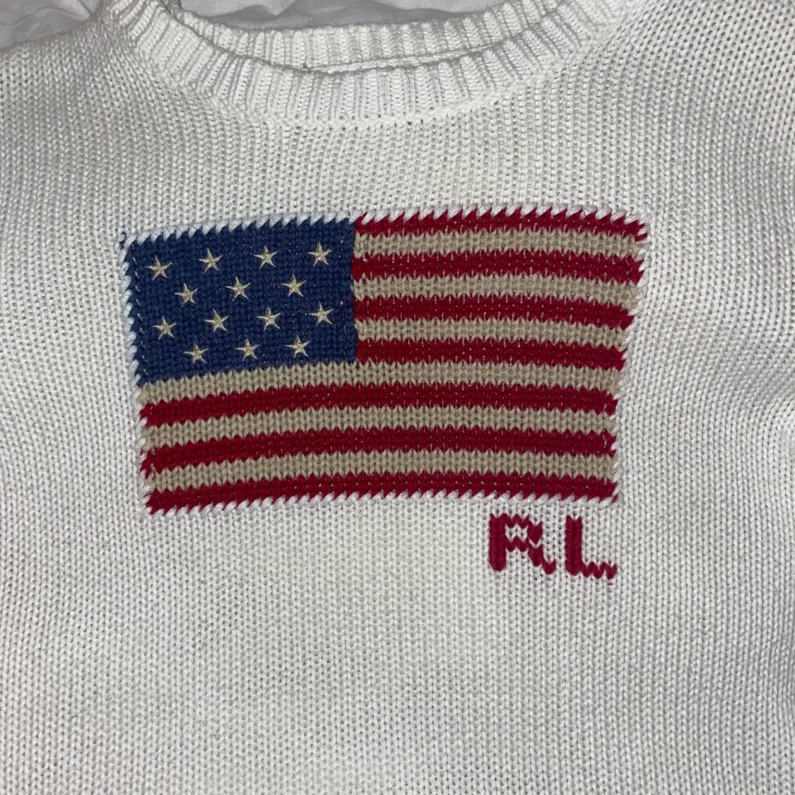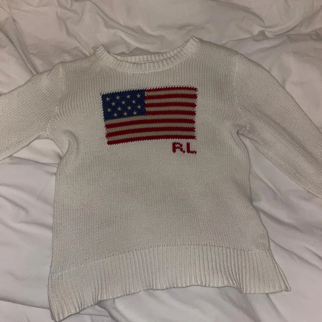 Vit stickad tröja från Ralph Lauren med amerikansk flagga och RL-broderi på bröstet. Tröjan har rund halsringning, långa ärmar och ribbade muddar. Perfekt för dig som gillar klassisk stil. Skriv ifall ni vill ha fler bilder och mått, vet inte original storleken men skulle säga att den är xxs eller 158-164. Inga defekter