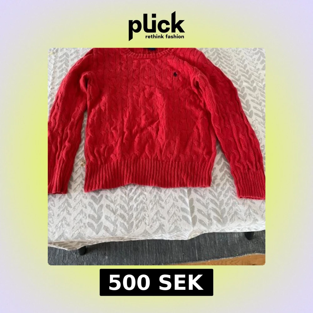 Säljer en snygg röd stickad tröja från Ralph Lauren med kabelstickat mönster och den klassiska loggan broderad på bröstet. Tröjan har långa ärmar och ribbade muddar vid ärmslut och nederkant. Perfekt för kyligare dagar!