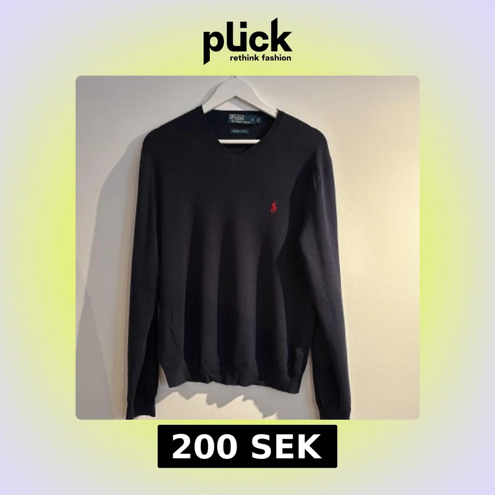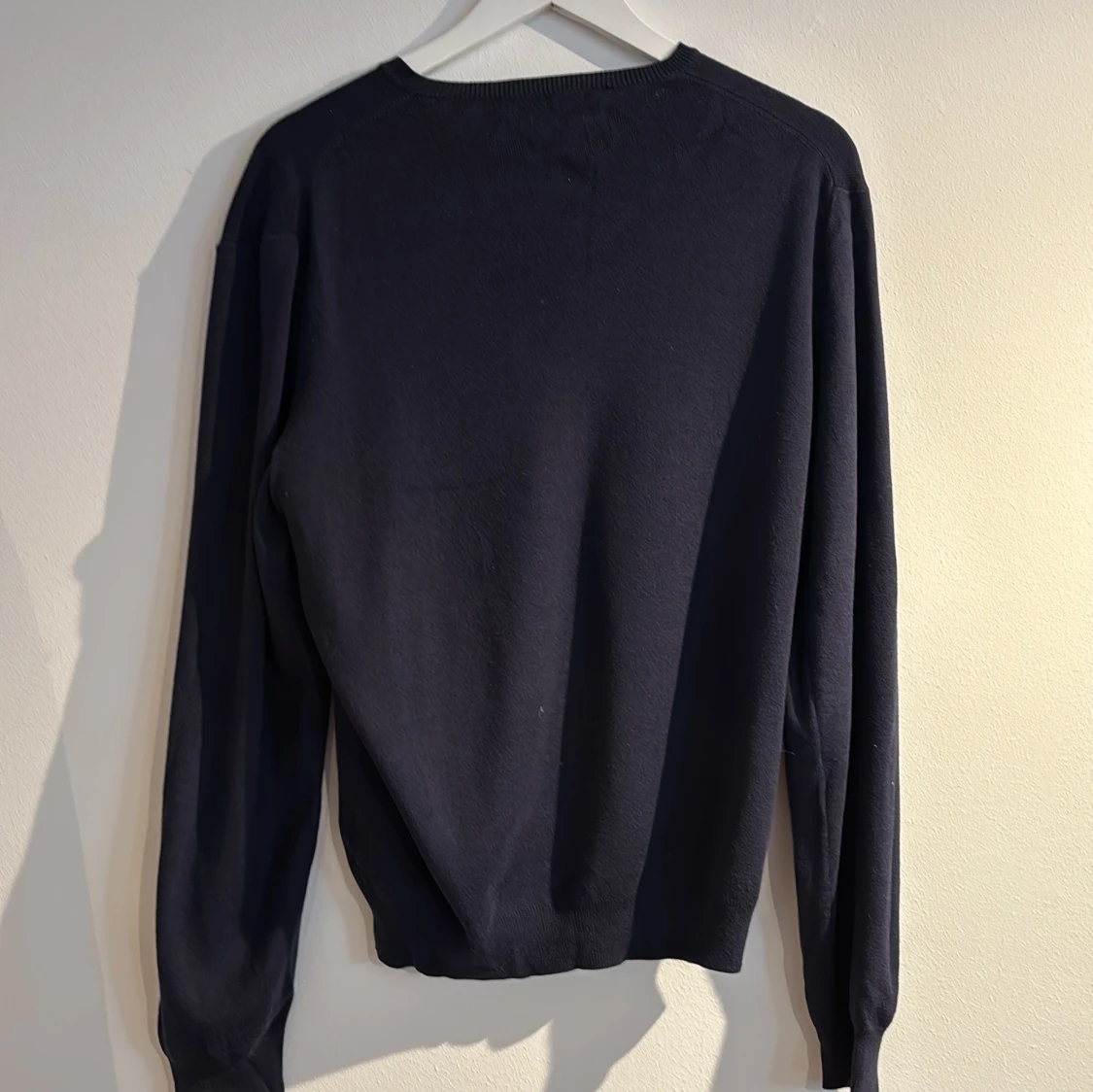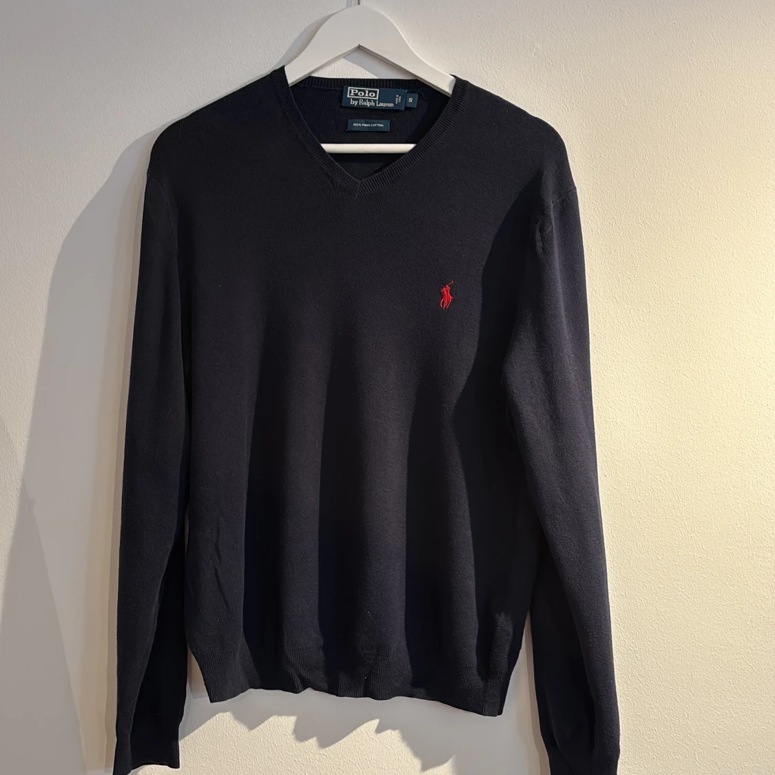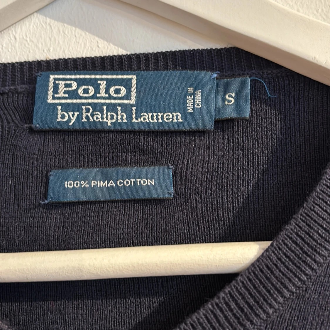 Säljer en stilren marinblå tröja från Polo Ralph Lauren i 100% Pima bomull. Tröjan har en klassisk v-ringning och ett rött broderat märke på bröstet. Perfekt för en elegant och avslappnad look.