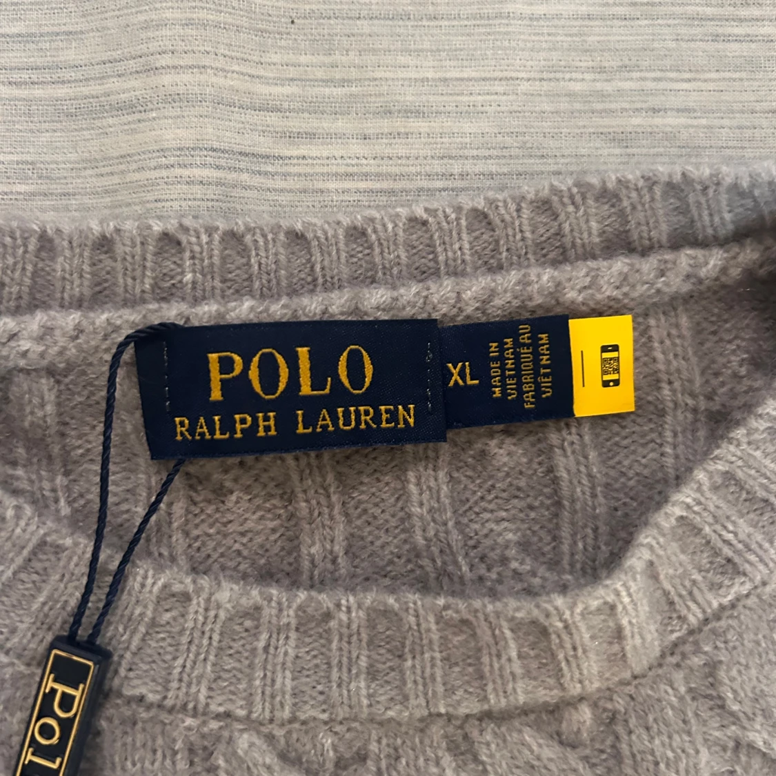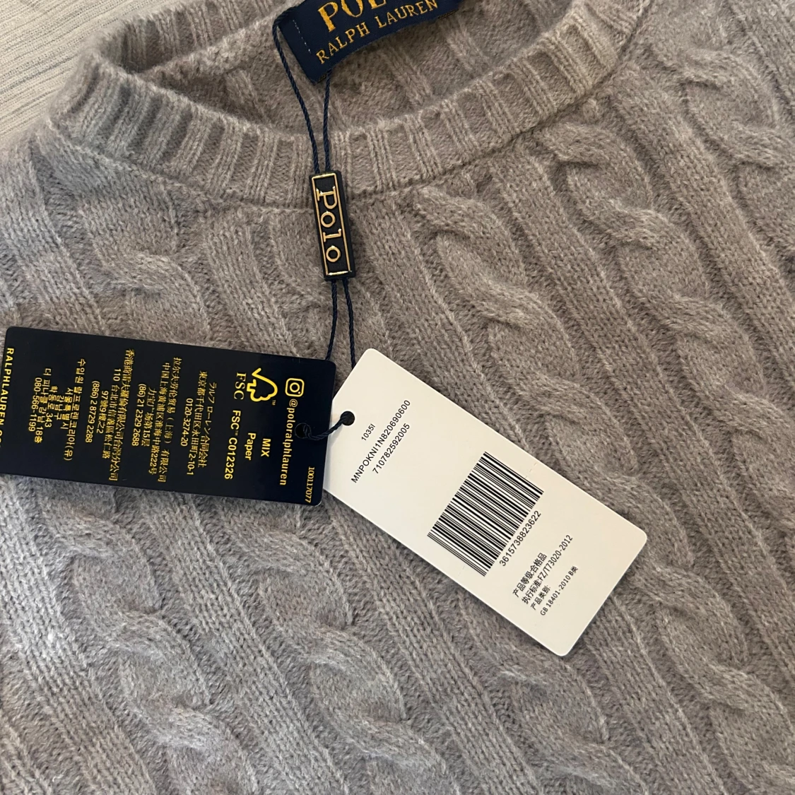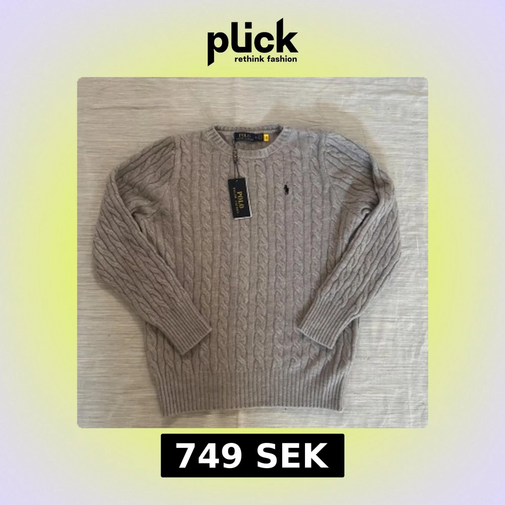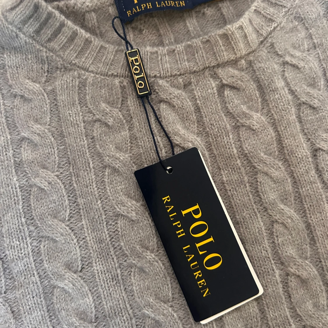 Kabelstickad tröja från Polo Ralph Lauren i en snygg ljusgrå nyans. Klassisk rund halsringning, ribbade muddar och ärmar. Tröjan har den ikoniska broderade loggan på bröstet och är tillverkad i mjuk ull för en lyxig känsla. Kvitto finns.