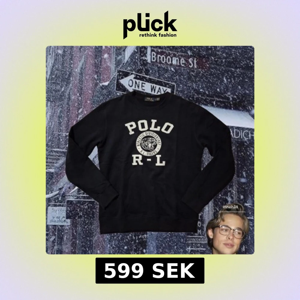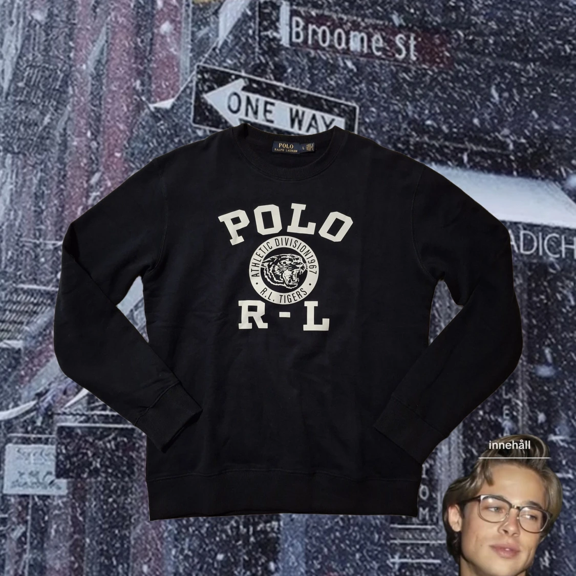Marinblå sweatshirt från Polo Ralph Lauren med vit tryckt logga och tigrar på bröstet. Klassisk rund halsringning och långa ärmar. Mjuk insida och ribbade muddar vid ärmslut och nederkant. Perfekt för en chill och sportig look. L man passar också M