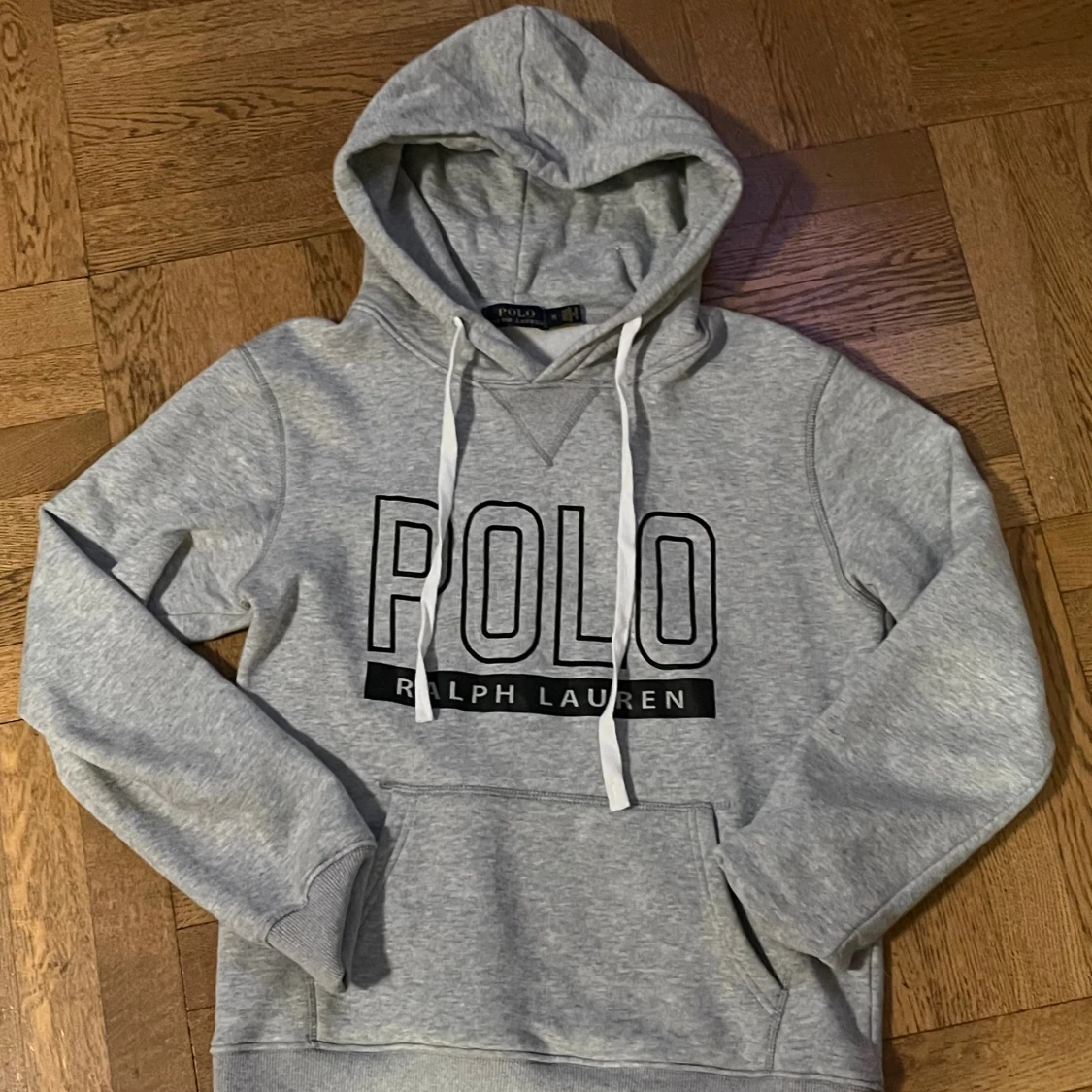 Snygg grå hoodie från Polo Ralph Lauren med stor logga framtill. Tröjan har huva med vita snören, magficka och ribbade muddar vid ärmslut och nederkant. Perfekt för chill dagar och streetstyle. Mjuk och skön bomullsmix som håller dig bekväm hela dagen.