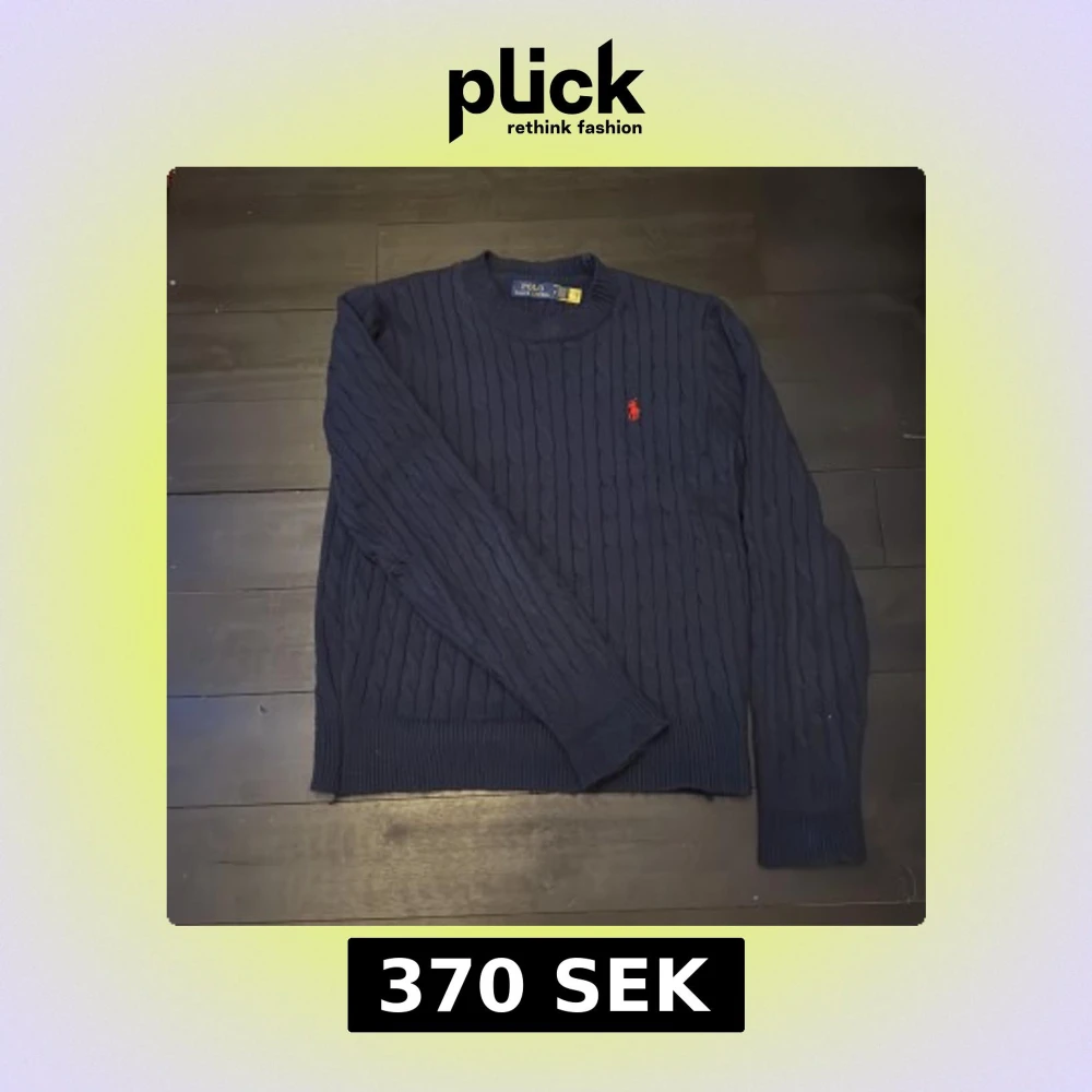 Säljer en klassisk mörkblå kabelstickad tröja från Polo Ralph Lauren med rund halsringning och röd broderad logga på bröstet. Tröjan har långa ärmar och ribbade muddar vid ärmslut och nederkant.