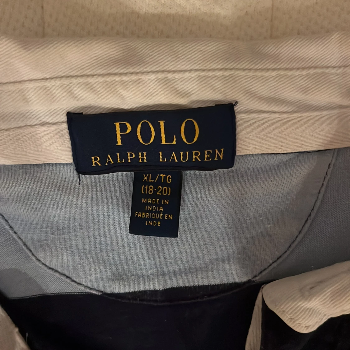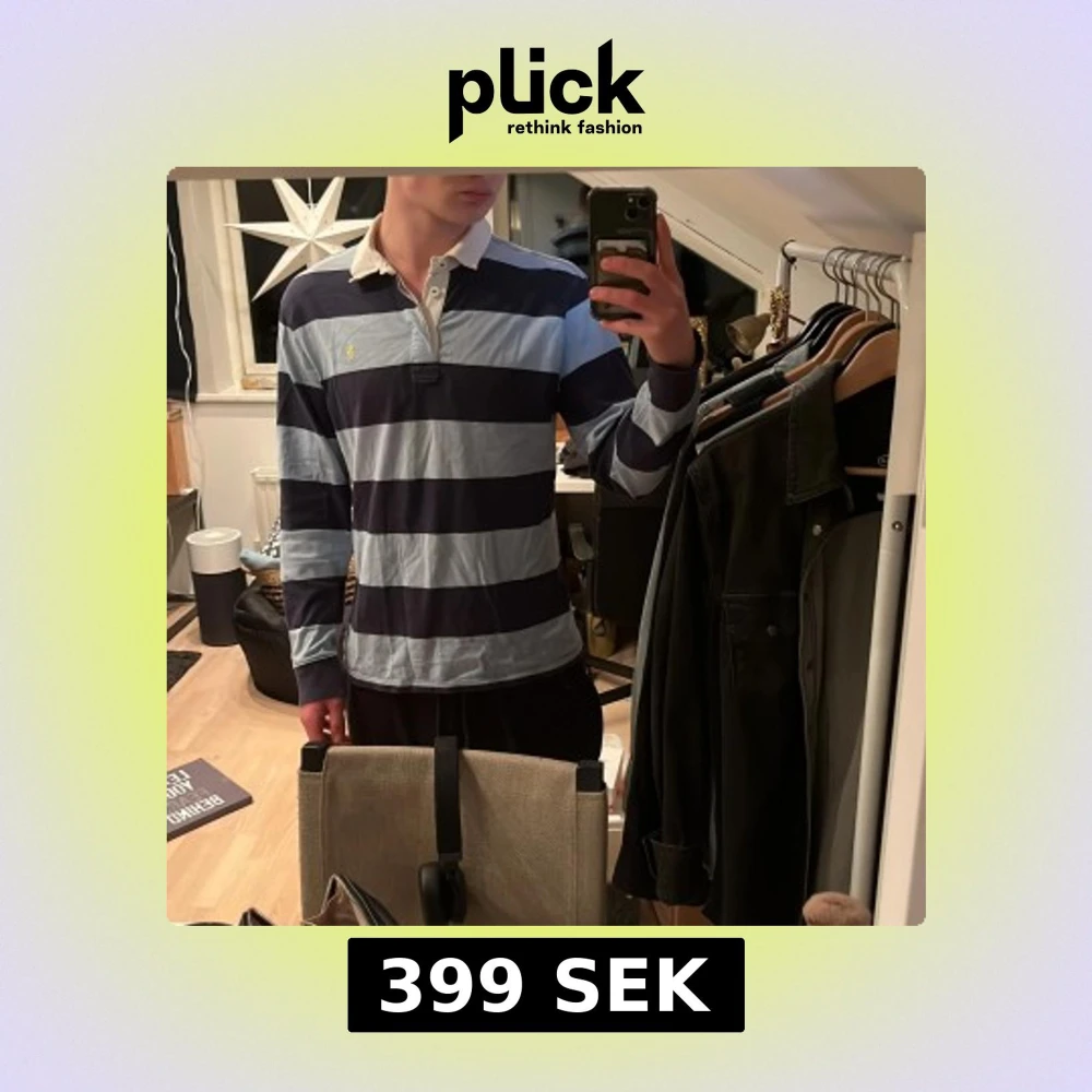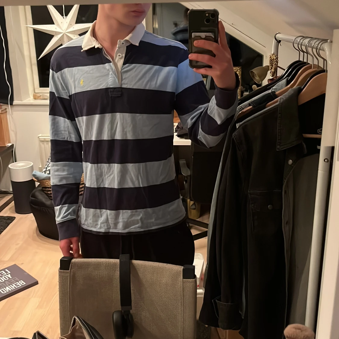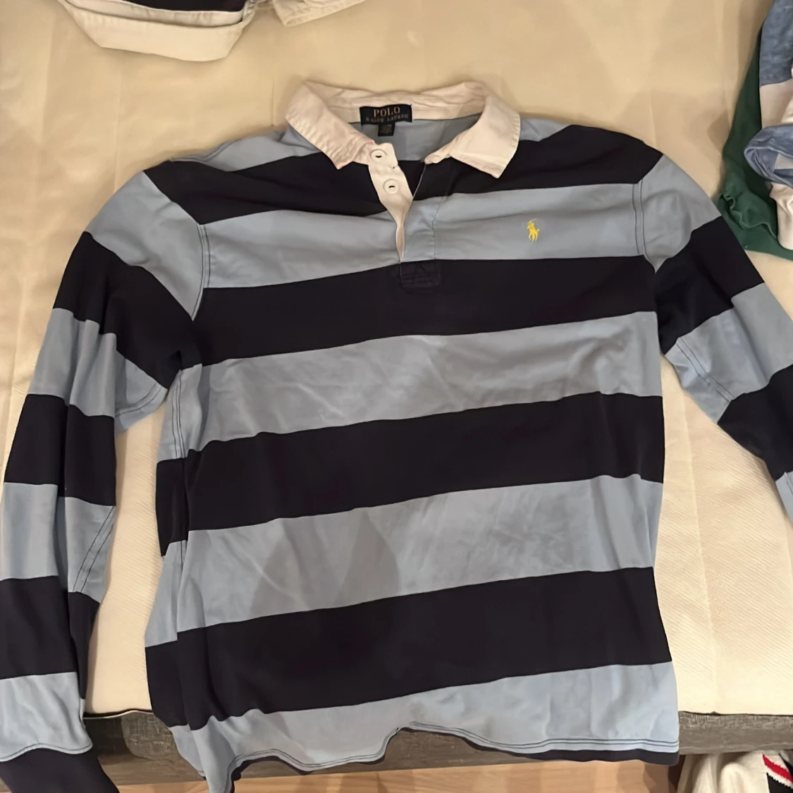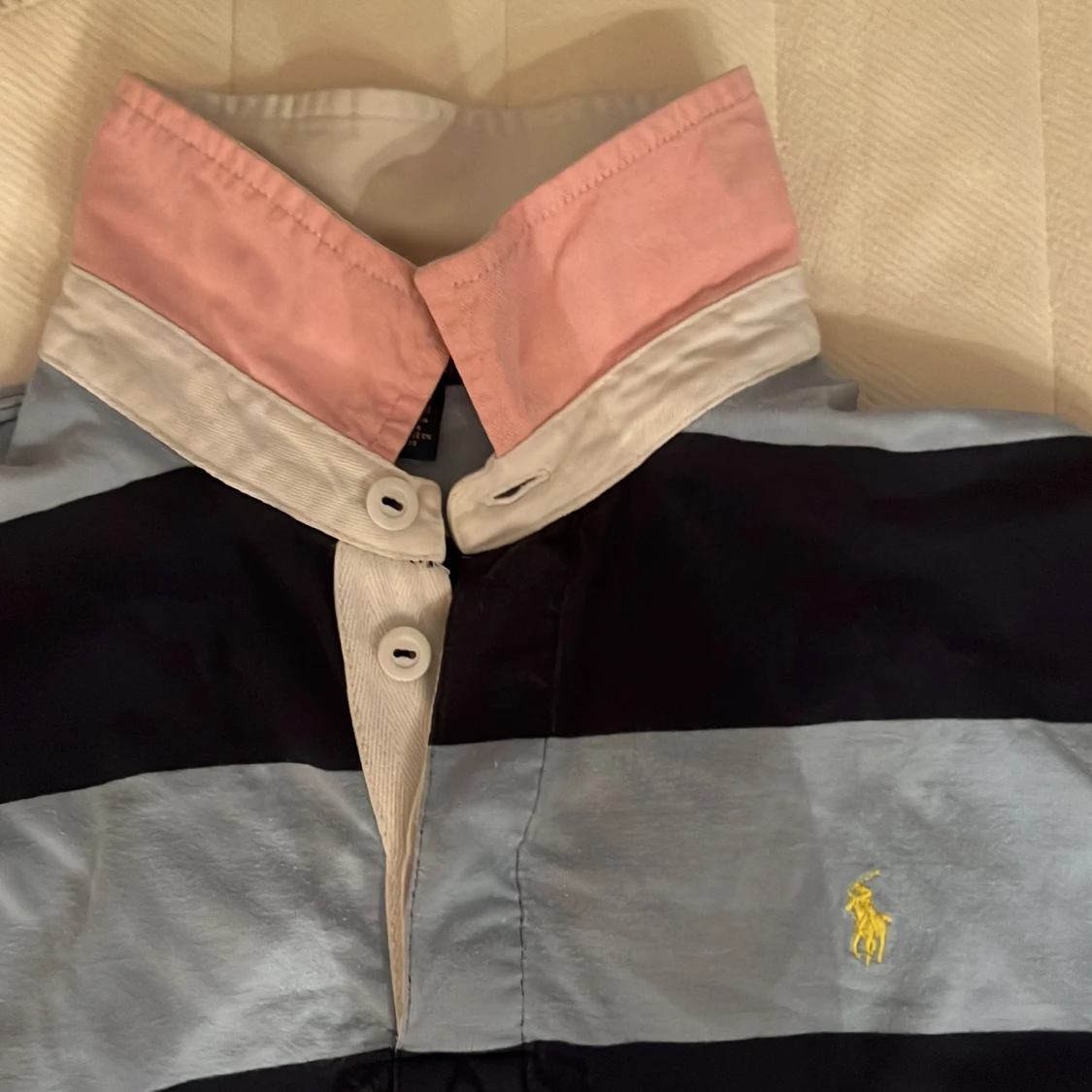 Säljer en klassisk randig pikétröja från Ralph Lauren i blå och ljusblå. Tröjan har långa ärmar och en kontrasterande krage i beige och rosa. Perfekt för en stilren look. Storlek m