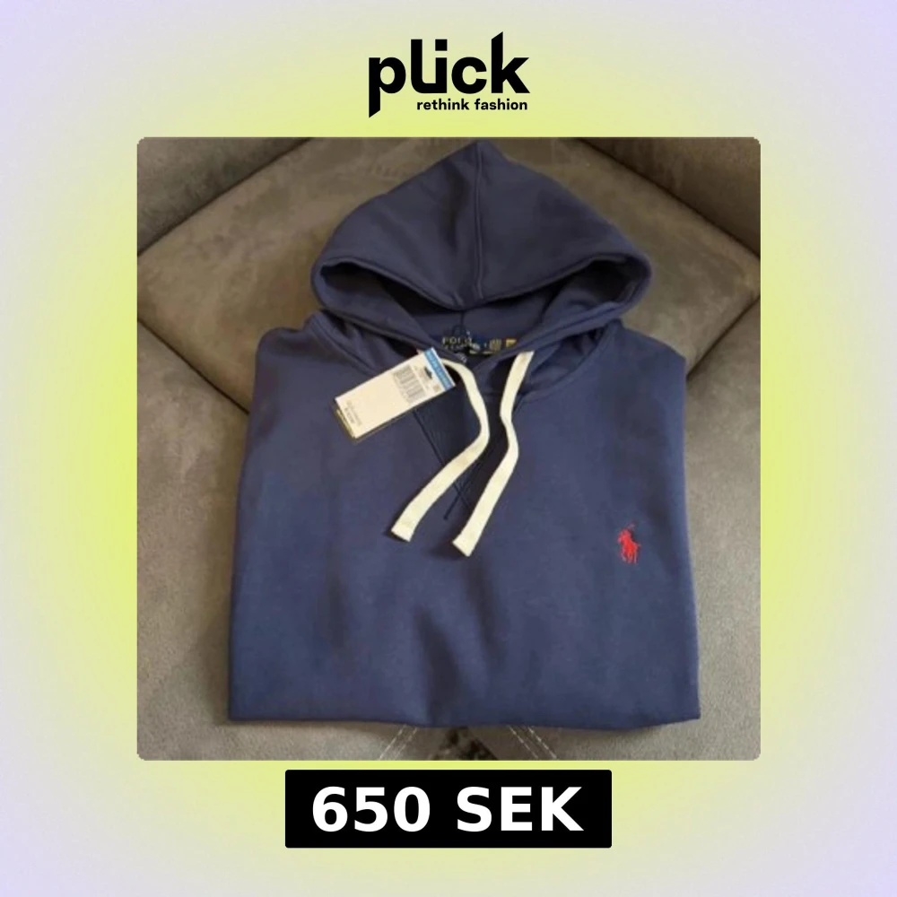 Snygg marinblå hoodie från Polo Ralph Lauren med vit snörning och klassisk röd logga broderad på bröstet. Tröjan har huva, känguruficka och ribbade muddar. Perfekt för en chill och stilren look.