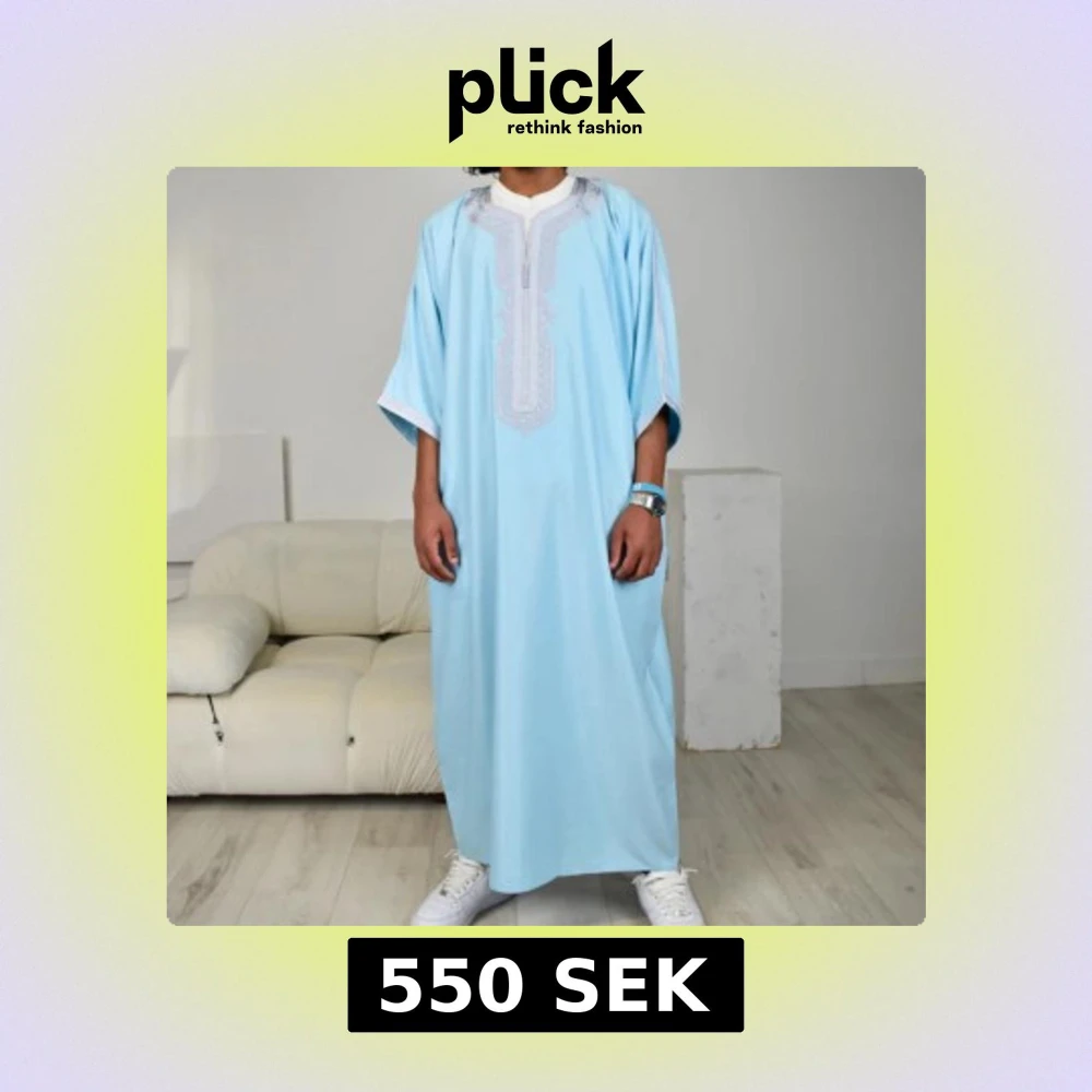 Snygg ljusblå kaftan med detaljerat broderi runt halsen. Den har en lös passform och korta ärmar, perfekt för en avslappnad stil. Passar bra till sneakers för en modern look. En väldigt fin och unik marockansk thobe säljer den pga den var för stor för mig och returen kostar ungefär lika mycket som summan jag betalade den är stor i storleken säljer för ungefär samma pris jag köpte den för inklusive frakt och tull kostnaderna
