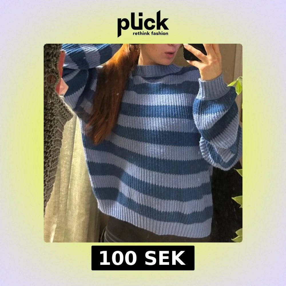 Säljer en mysig stickad tröja i blå och mörkblå ränder. Tröjan har en avslappnad passform med långa ärmar och ribbade muddar. Perfekt för kyliga dagar!