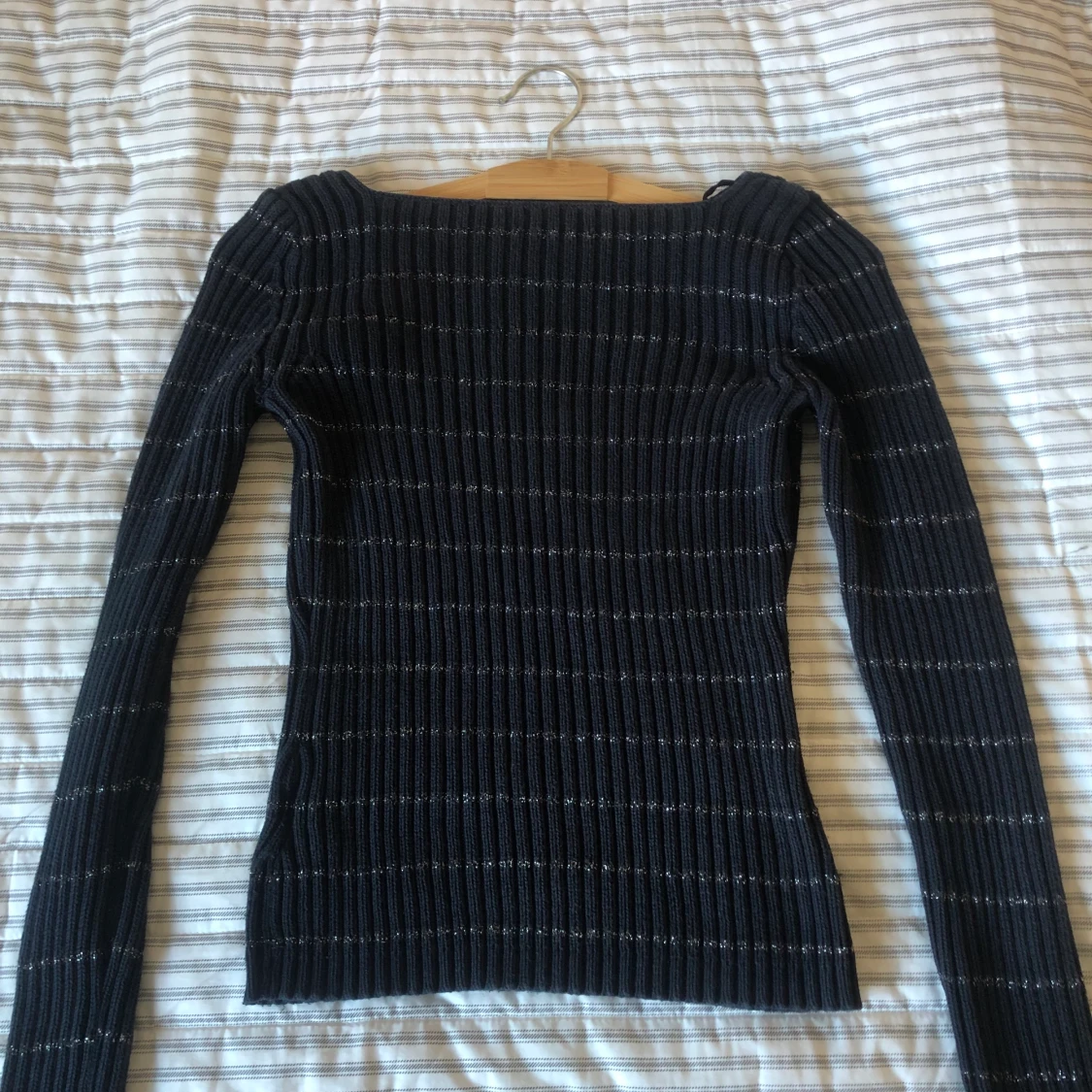 Mörkblå tröja med silvriga ränder. Passar XS/S. Seljer för 120 + frakt (pris kan diskuteras)