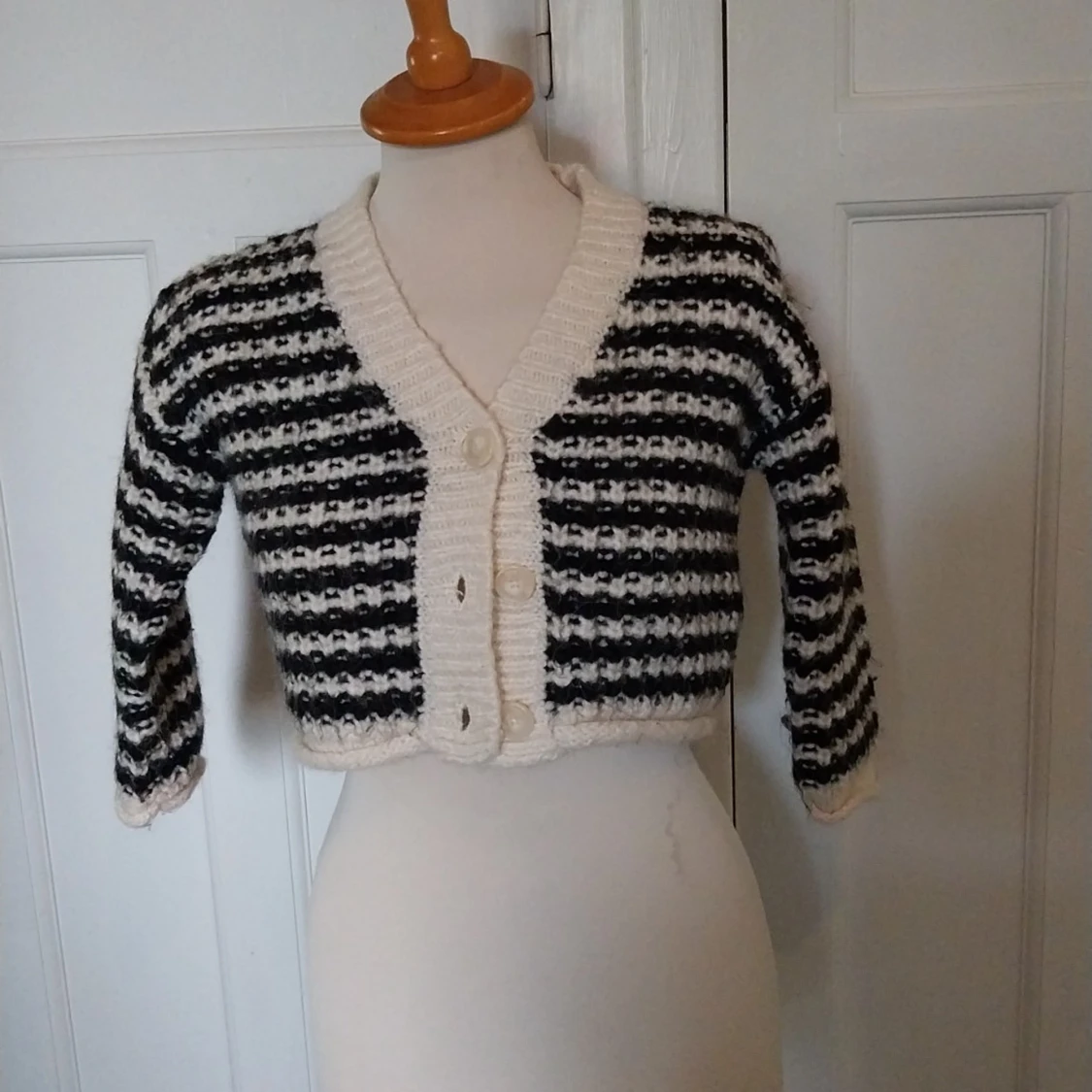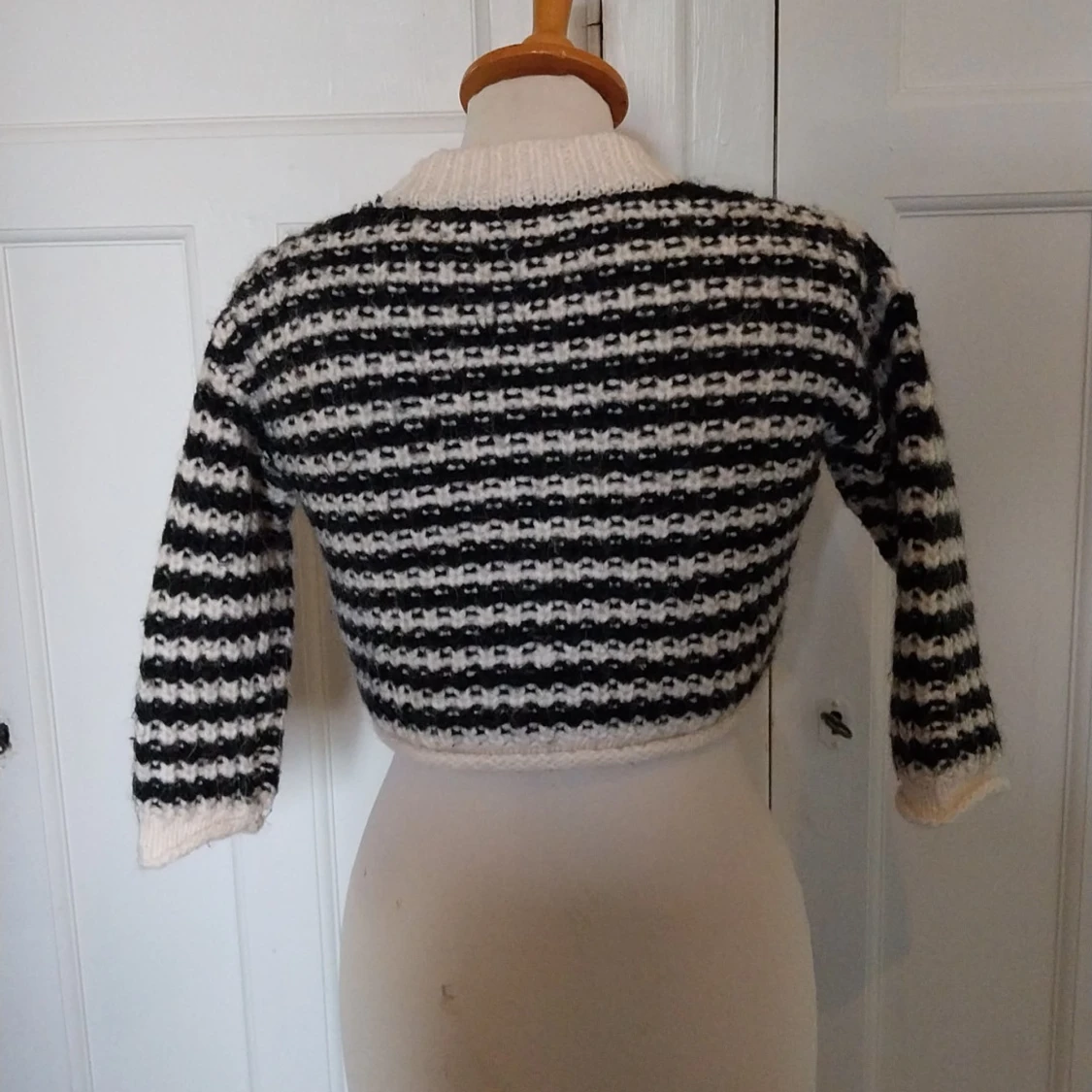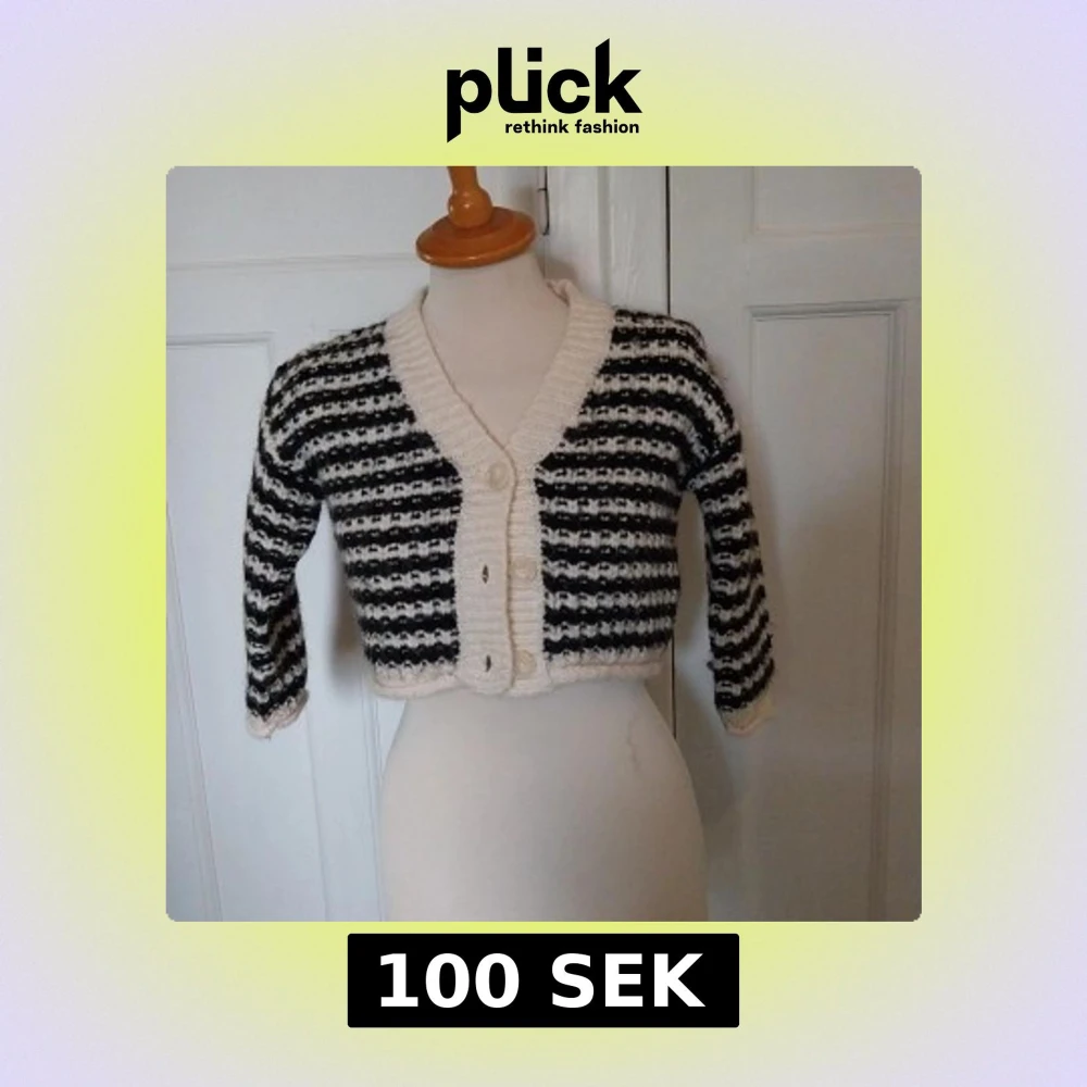 Säljer en stickad, croppad kofta med svartvita ränder och breda ribbade kanter. Koftan har tre stora knappar framtill, lång ärm och en chunky känsla. Perfekt för dig som gillar retrovibbar och vill sticka ut lite extra.