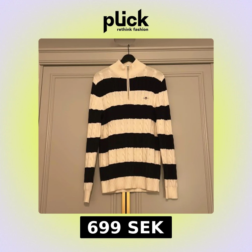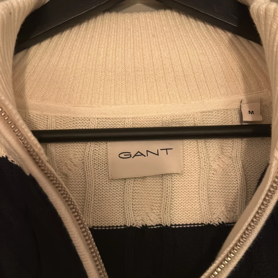 Säljer en snygg stickad tröja från GANT i storlek M. Tröjan är näst intill aldrig använd och Tröjan har breda mörkblå och vita ränder, half zip i halsen och kabelstickat mönster. Hör av dig vid funderingar Mvh/Max