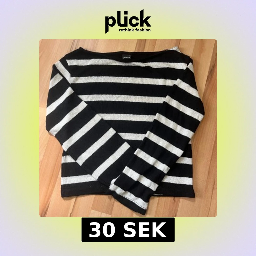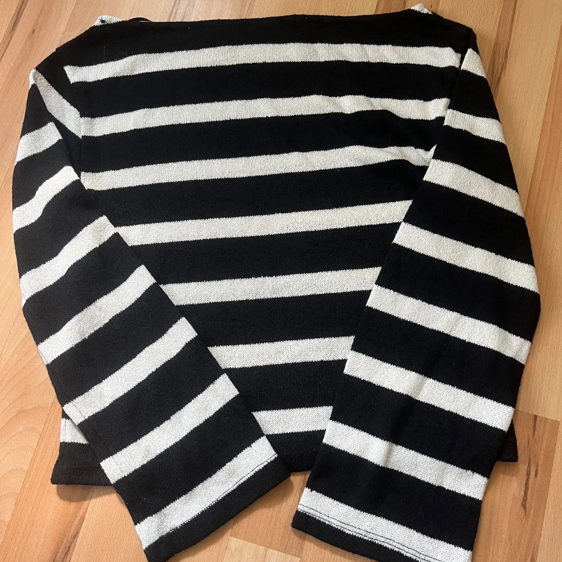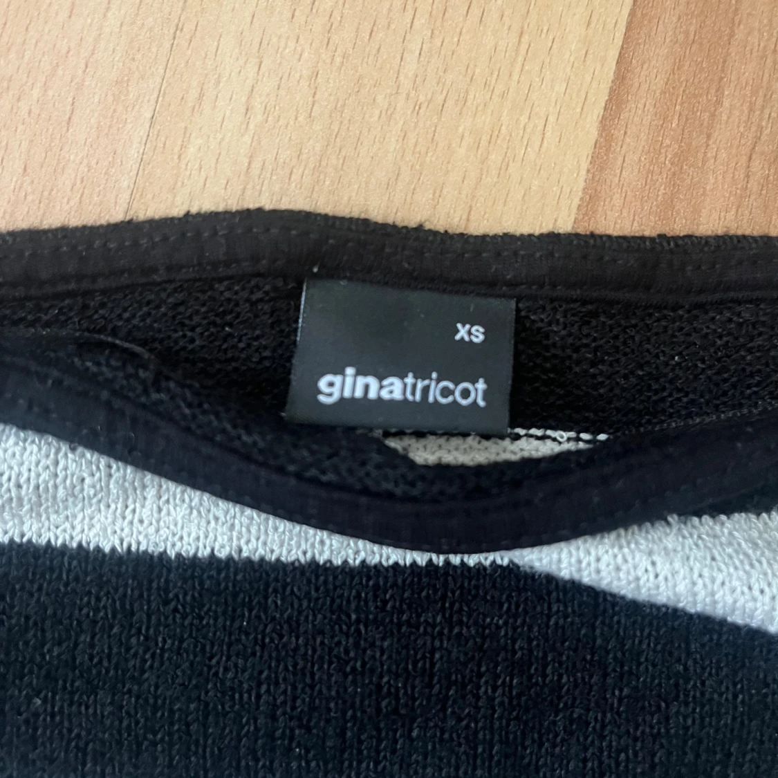 Säljer en svart och vit randig tröja från Gina Tricot i storlek XS. Tröjan har långa ärmar och en klassisk rak passform. Sitter off shoulder