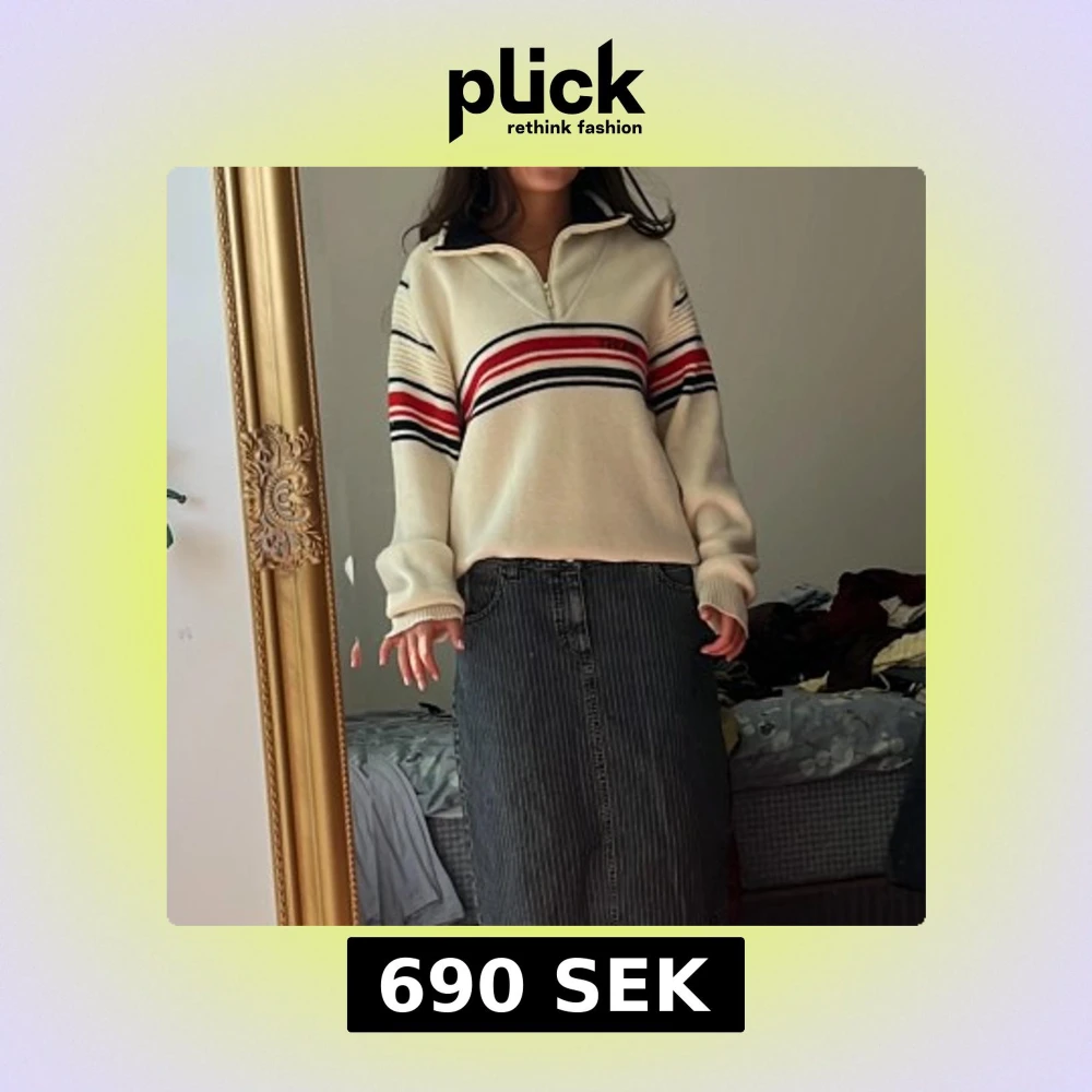 Säljer en retro offwhite tröja från Sprint med coola röda och marinblå ränder över bröstet och ärmarna. Tröjan har en hög krage med half zip och är långärmad. Materialet är 100% ull och känns mjukt och skönt mot huden. Perfekt för dig som gillar vintagevibbar!