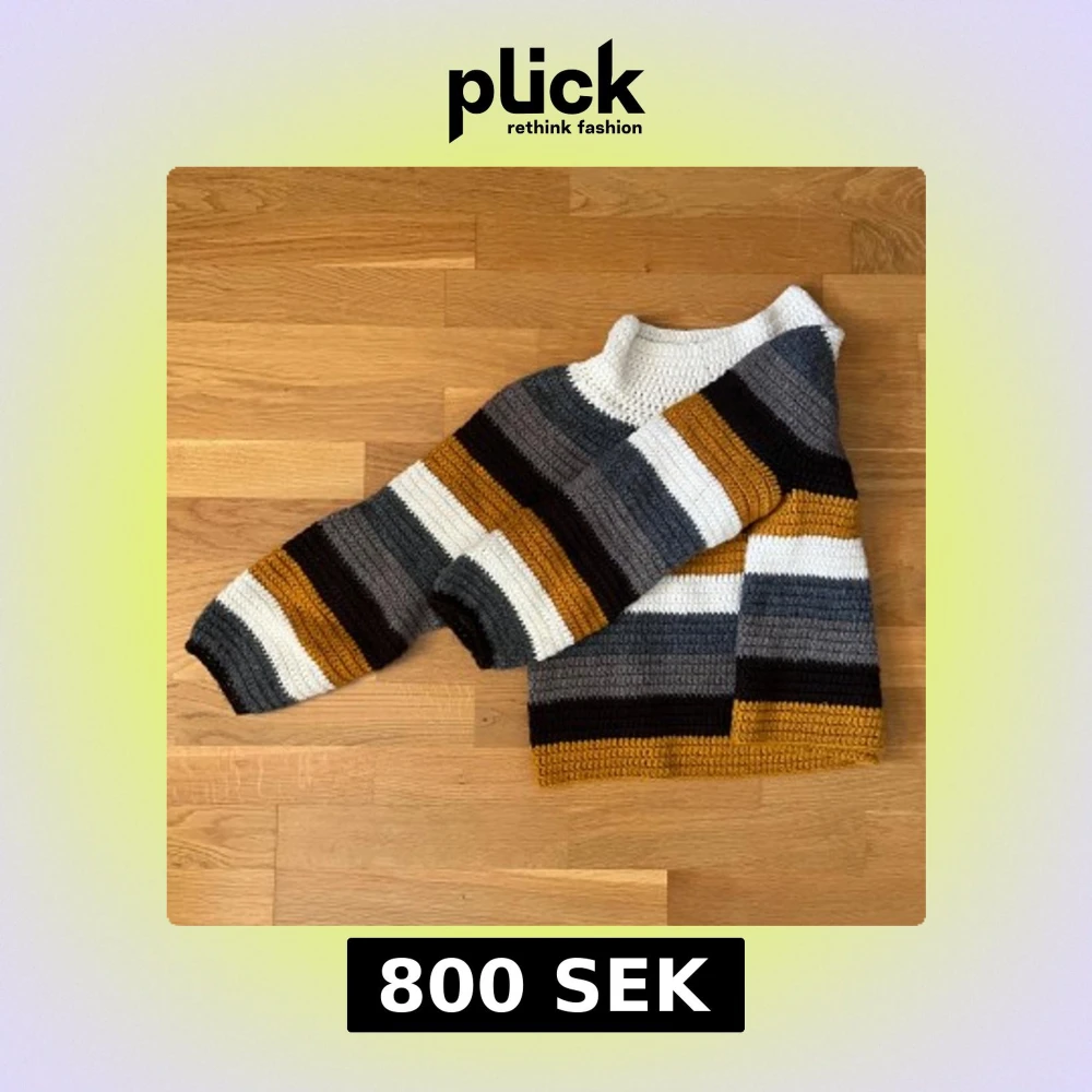 Säljer en handvirkad, randig tröja i sköna höstfärger. Tröjan har breda ränder i vitt, grått, svart och senapsgult samt en högre krage. Den är stickad i ett mjukt bomullsgarn och har lång ärm och loose passform. Perfekt för dig som gillar unika plagg!
