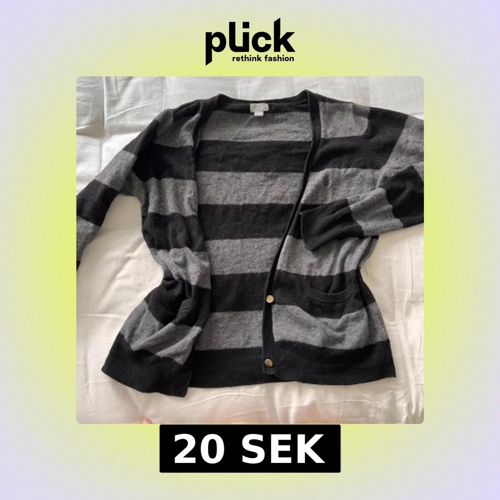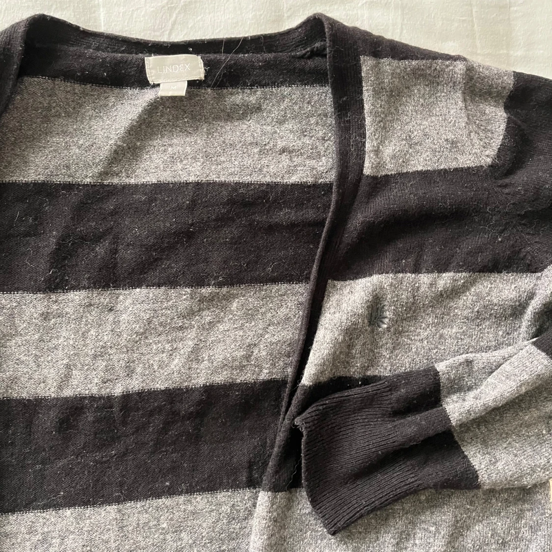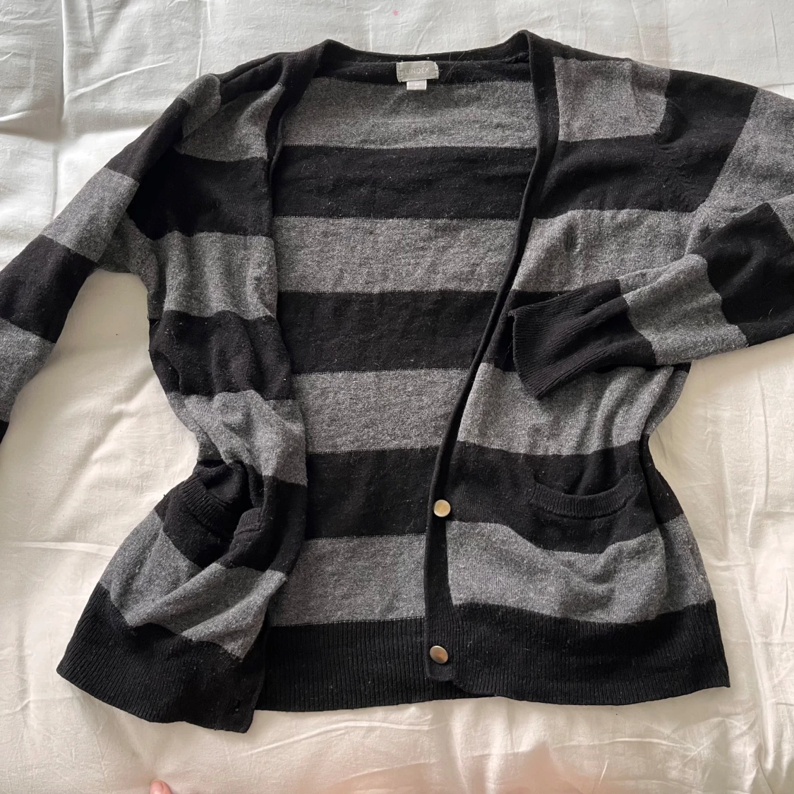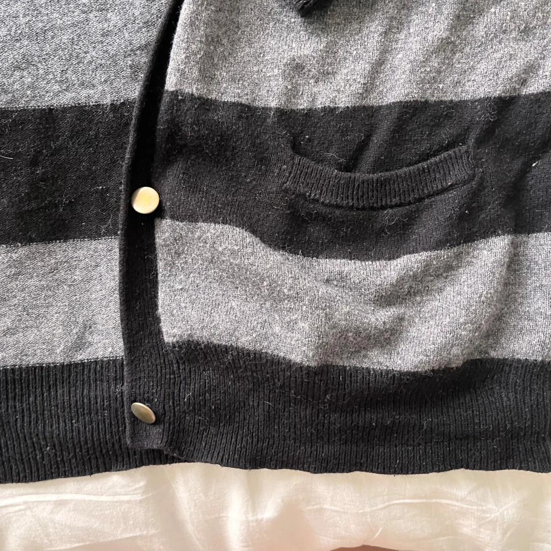 Kofta i svart och grått med breda ränder. Modellen har långa ärmar, två fickor framtill och stängs med två guldiga knappar.
