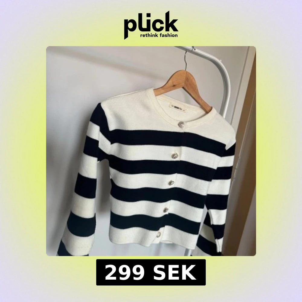 Säljer en snygg svartvit randig kofta. Koftan har långa ärmar och knappar framtill. Perfekt för en stilren look. Passar till både jeans och kjol!