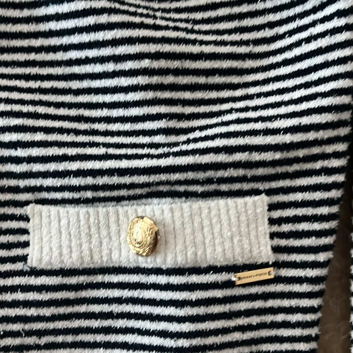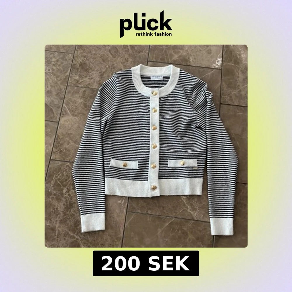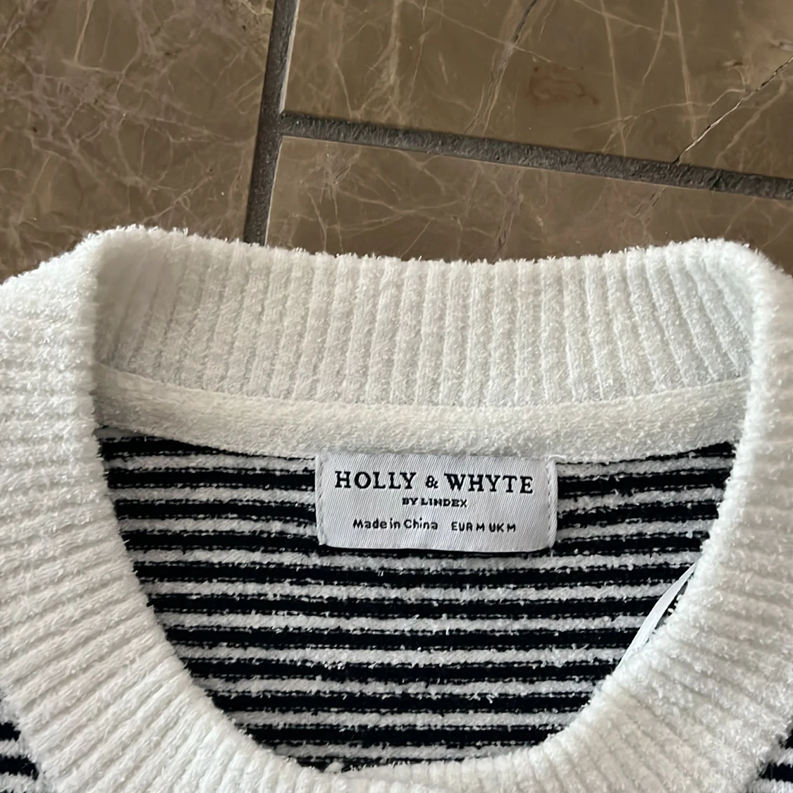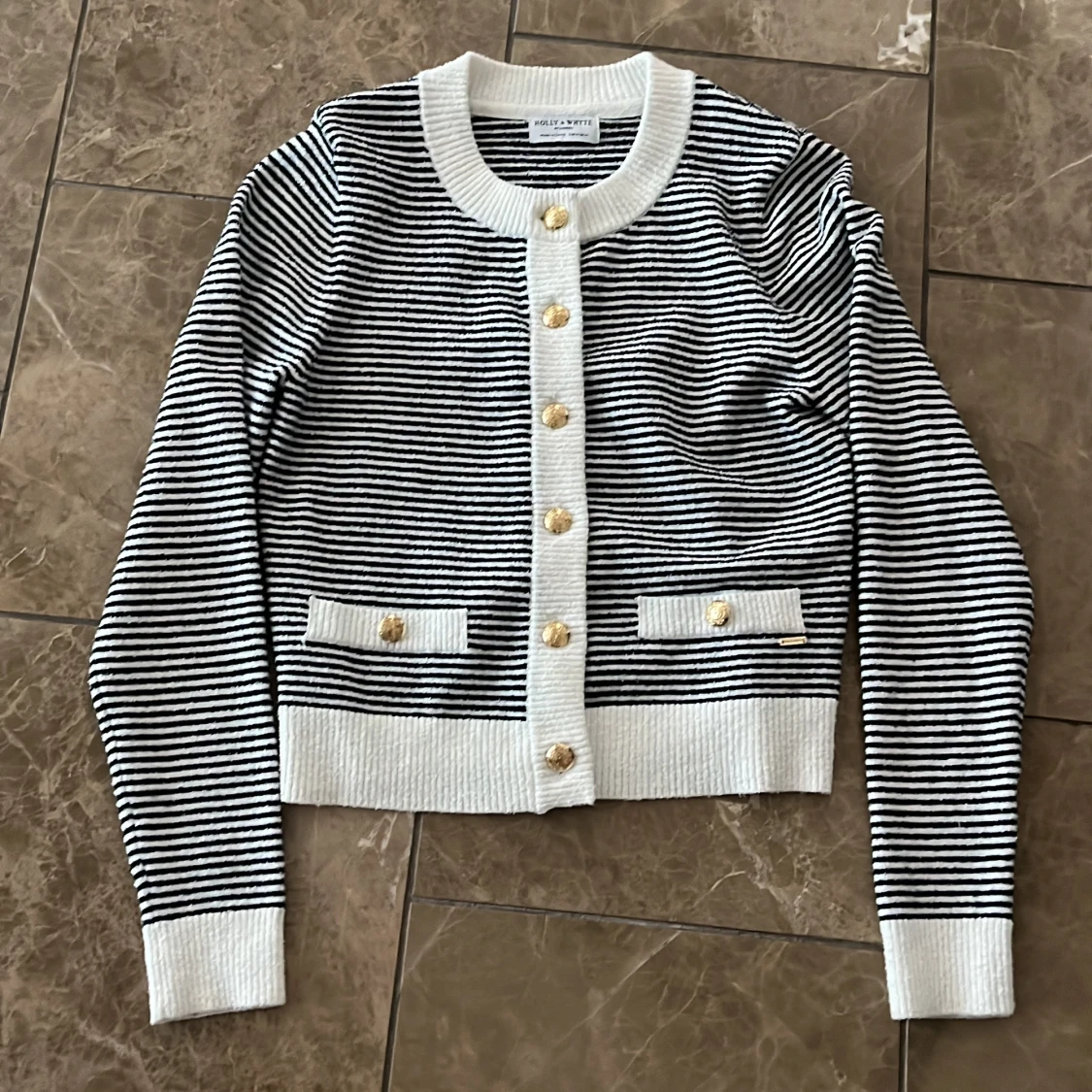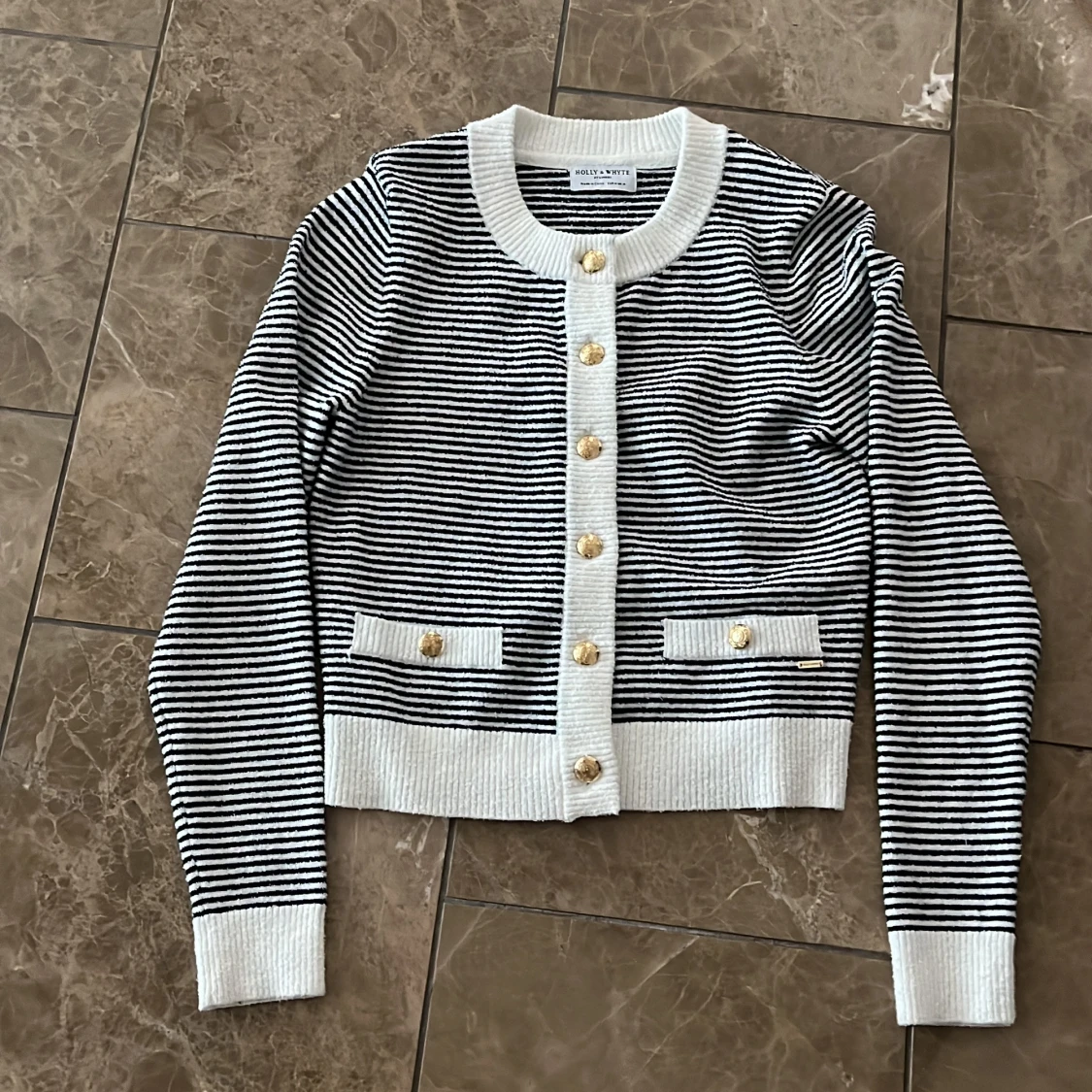 Snygg randig kofta från Holly & Whyte med svarta och vita ränder, guldiga knappar och ribbade muddar. Koftan har två dekorativa fickor framtill och är långärmad med klassisk rund hals. Perfekt för att lyfta din outfit med en preppy touch.