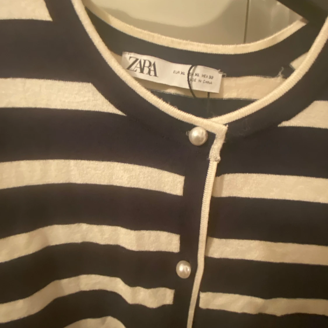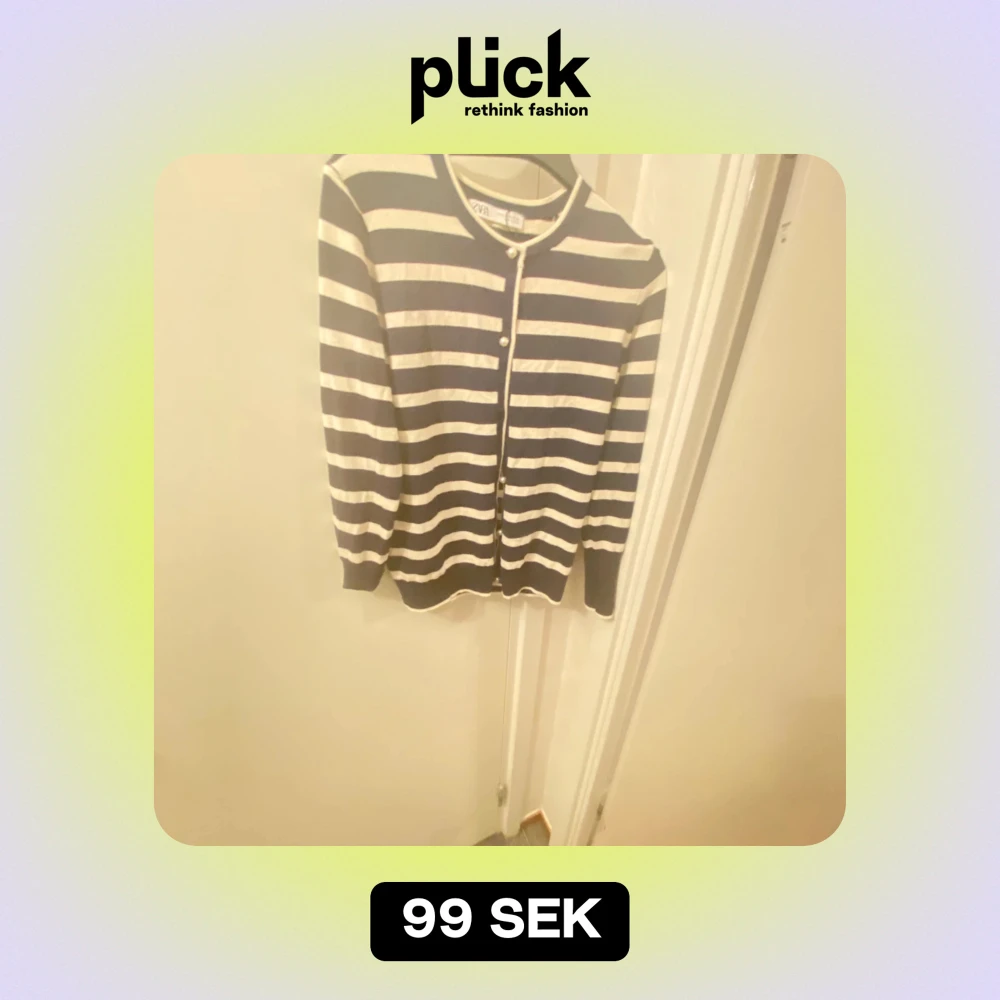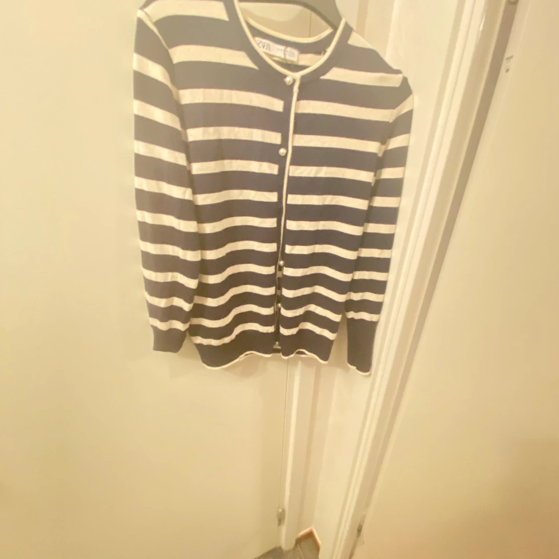 Säljer en snygg randig kofta från Zara i marinblå och vit. Den har långa ärmar och knappar framtill. Perfekt för både vår och höst, och funkar lika bra till vardags som till lite finare tillfällen. Superbekväm och stilren!
