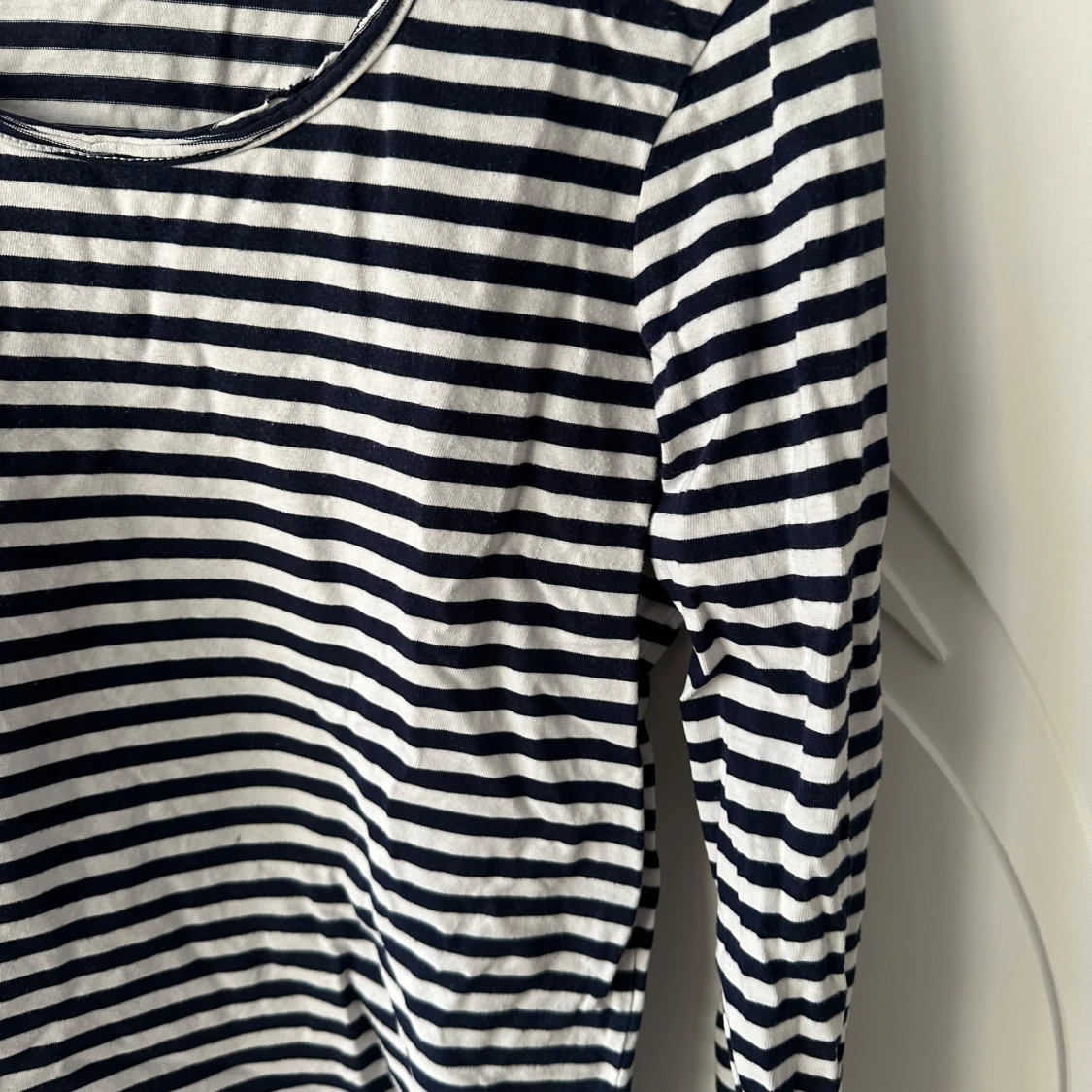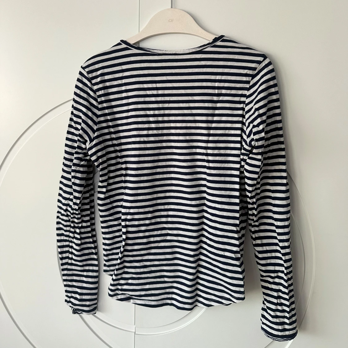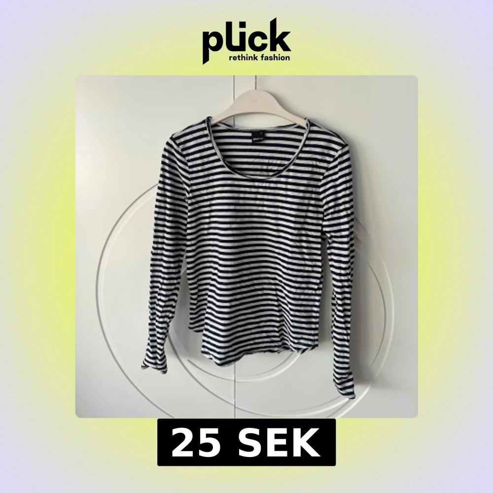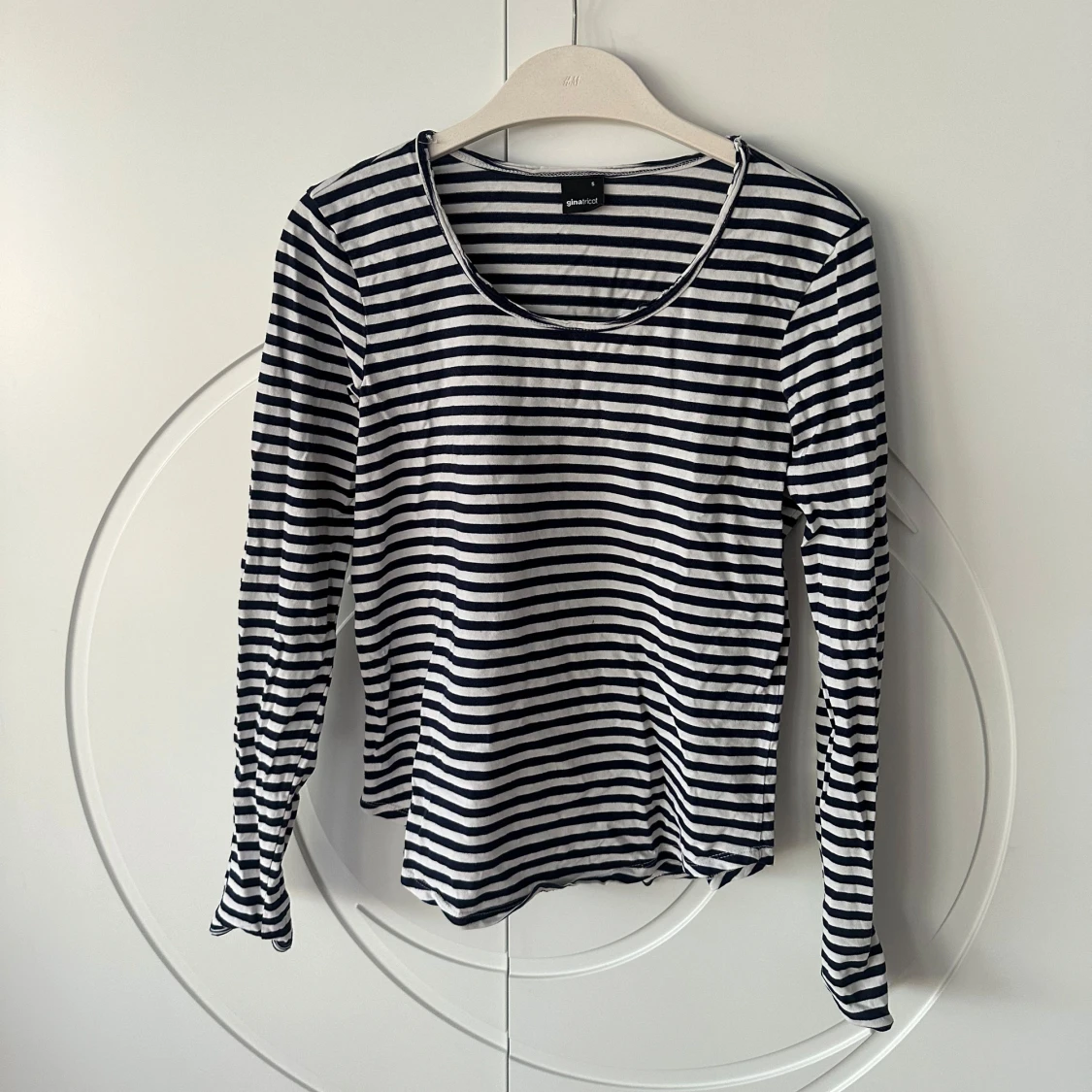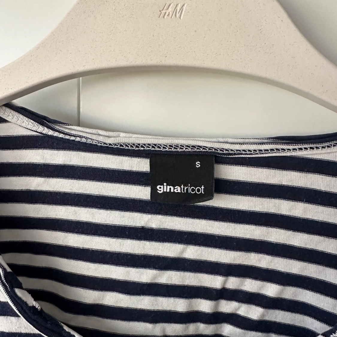 Säljer en stilren randig topp från Gina Tricot i storlek S. Den har ett klassiskt marinblå mönster och långa ärmar, perfekt för en avslappnad look. Bra basic plagg i garderoben✨