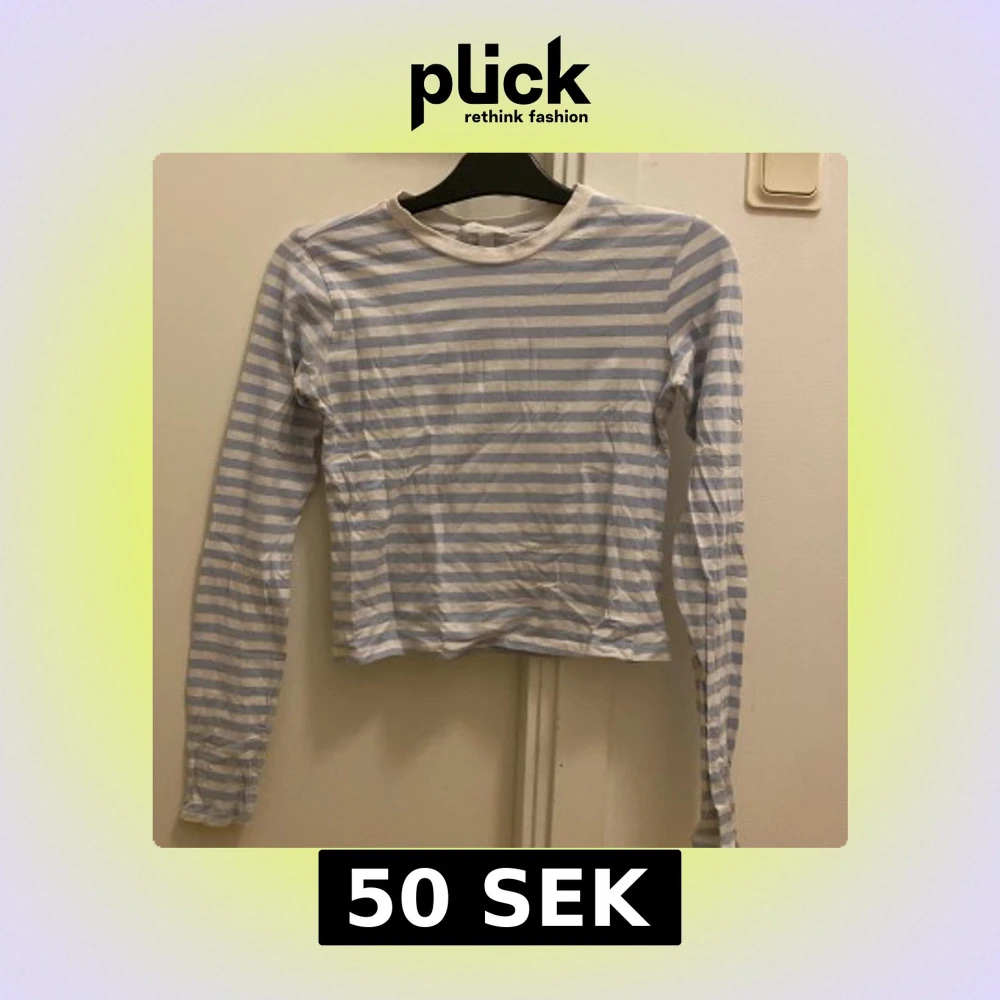 Säljer en randig långärmad topp från H&M i ljusblått och vitt. Perfekt för en avslappnad stil. Toppen har en rund halsringning och är gjord i ett mjukt material.