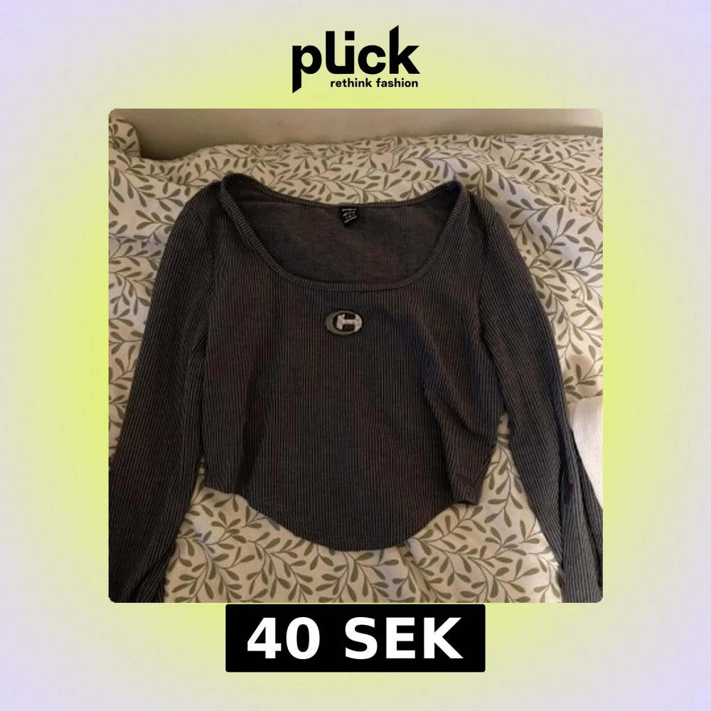 Säljer en mörkgrå långärmad topp. Tröjan har en djup, rundad urringning och en snygg brosch med glittrande detaljer framtill. Storleken är xs men känns tight, perfekt för en trendig look.
