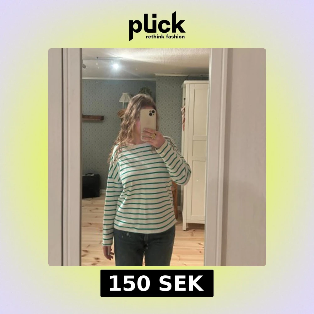 Säljer en söt randig tröja med gröna och vita ränder. Tröjan har långa ärmar och en avslappnad passform, perfekt för en casual look. Den är också väldigt bekväm i materialet! Passar bra till jeans eller kjol. Köpt för 350kr