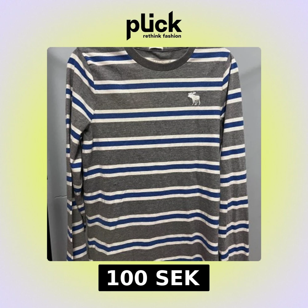 Snygg långärmad tröja från Abercrombie & Fitch i grått med blå och vita ränder. Klassisk rund halsringning och broderad älg-logga på bröstet. Skön passform och perfekt för dig som gillar en avslappnad men stilren look.