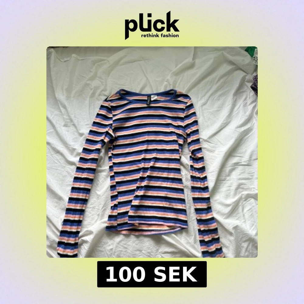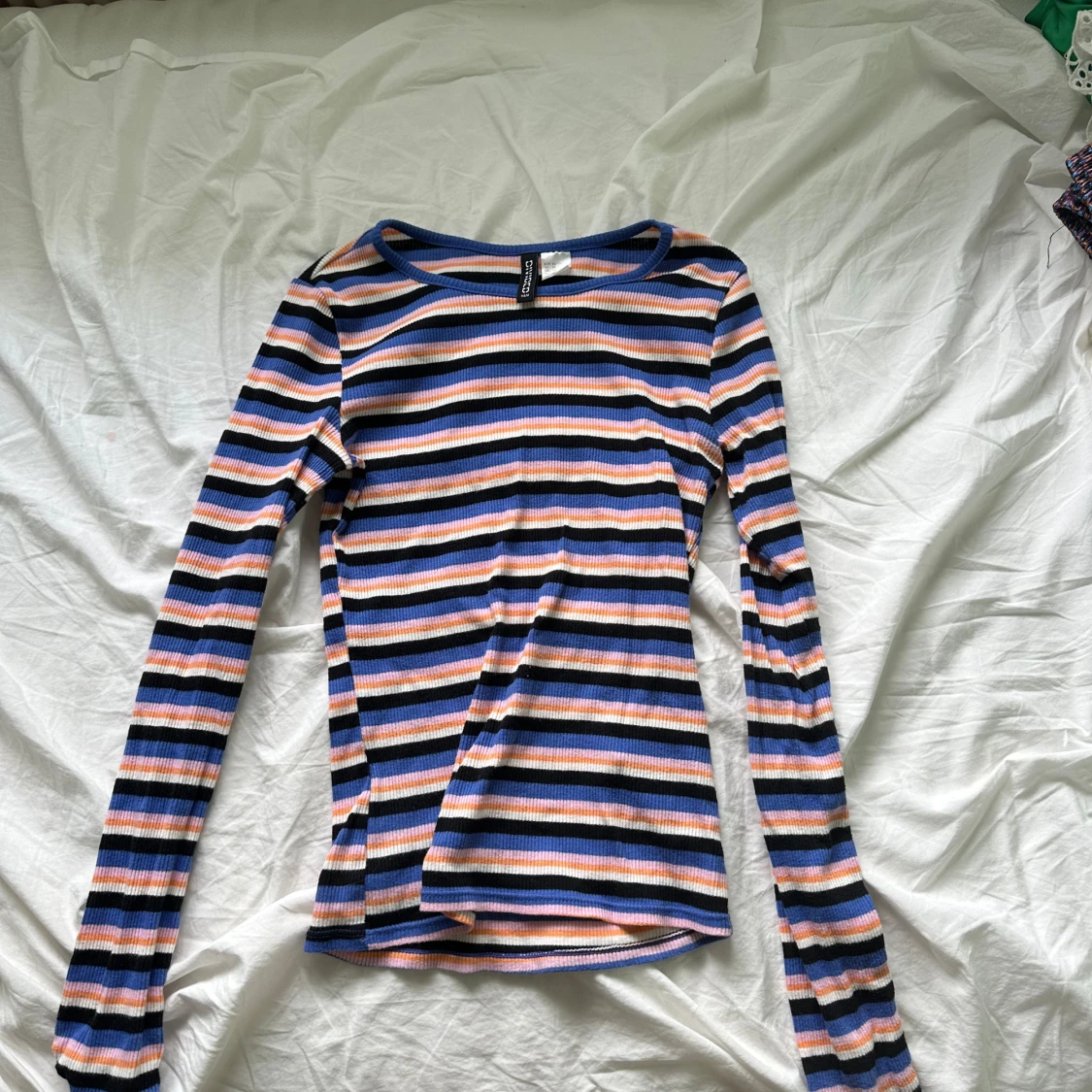 Säljer en ribbad långärmad tröja från H&M Divided i storlek XS. Tröjan har färgglada ränder i blått, svart, vitt, orange och rosa. Den är figurnära och har en klassisk rund halsringning. Perfekt för dig som gillar färg och mönster!