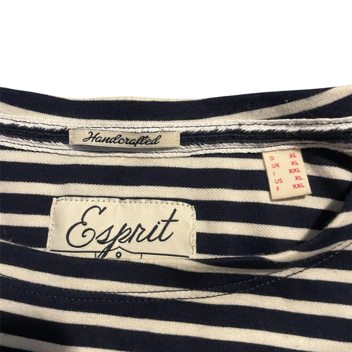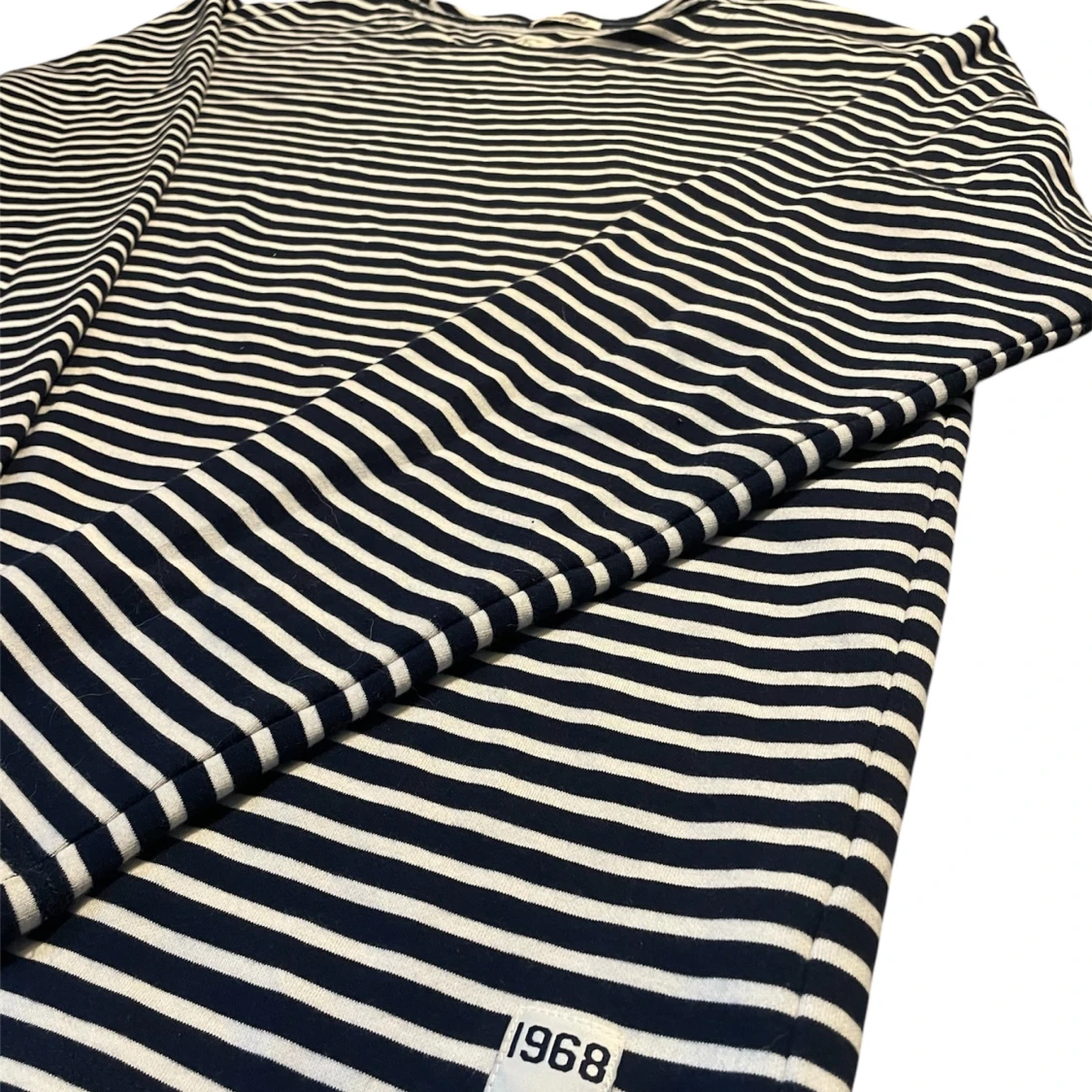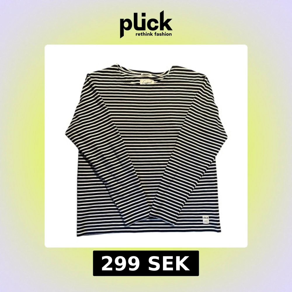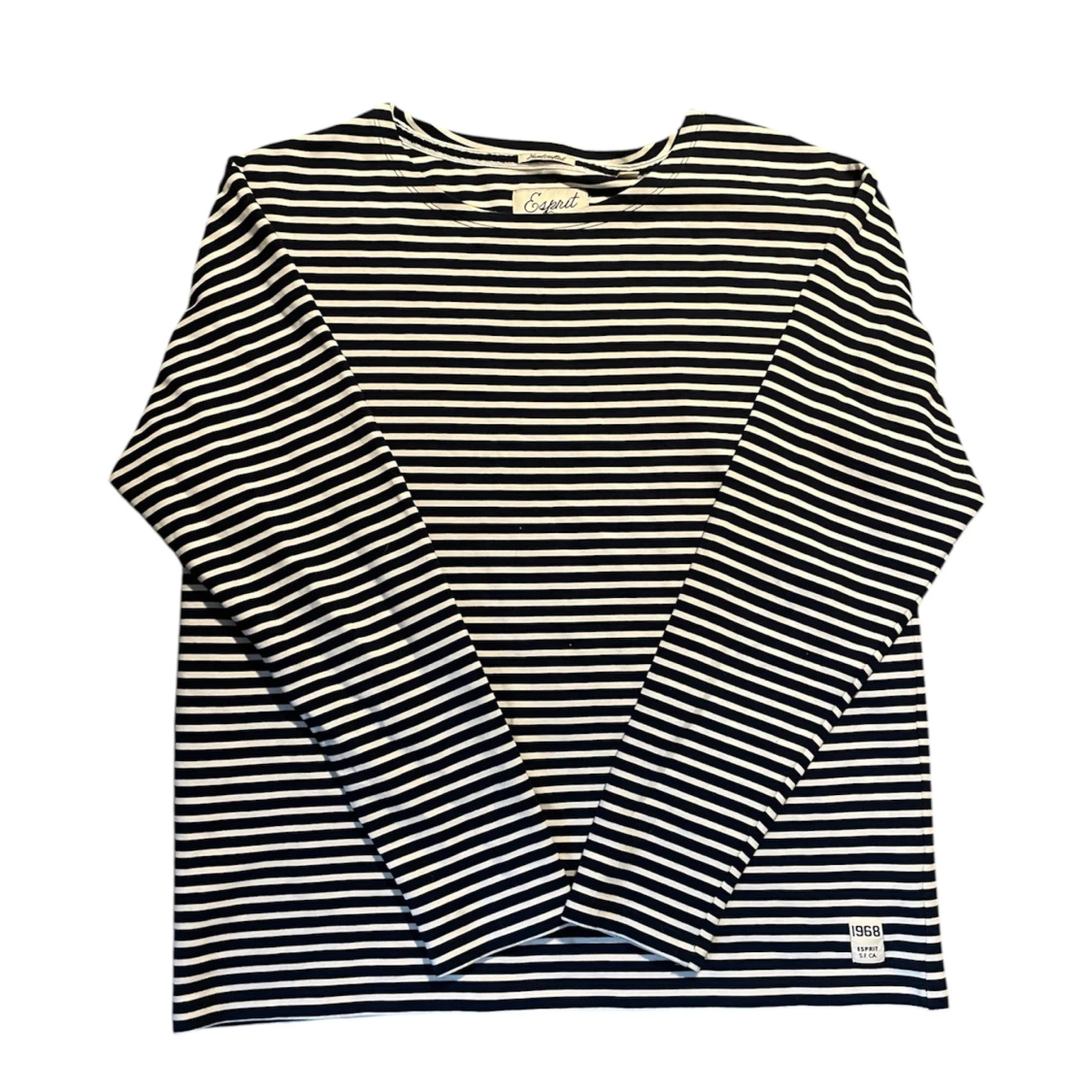 Säljer en klassisk långärmad tröja från Esprit i marinblått och vitt med smala ränder. Tröjan har rund halsringning och en liten patch med '1968' nertill. Tillverkad i mjuk bomull, perfekt för en chill och stilren look.