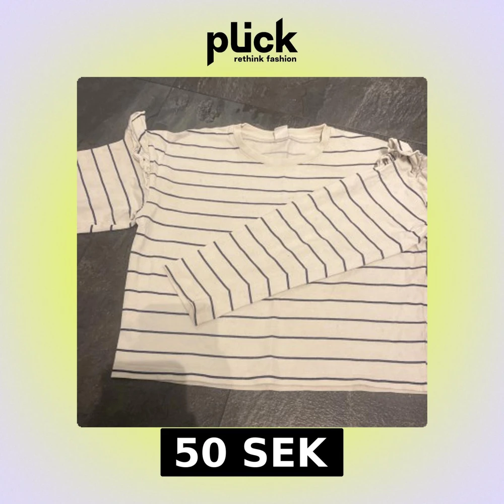 Vit långärmad tröja från Lindex med tunna marinblå ränder. Tröjan har en klassisk rund halsringning och är gjord i mjuk bomull. Perfekt för en chill och stilren look, funkar året runt och är lätt att matcha med jeans eller kjol.