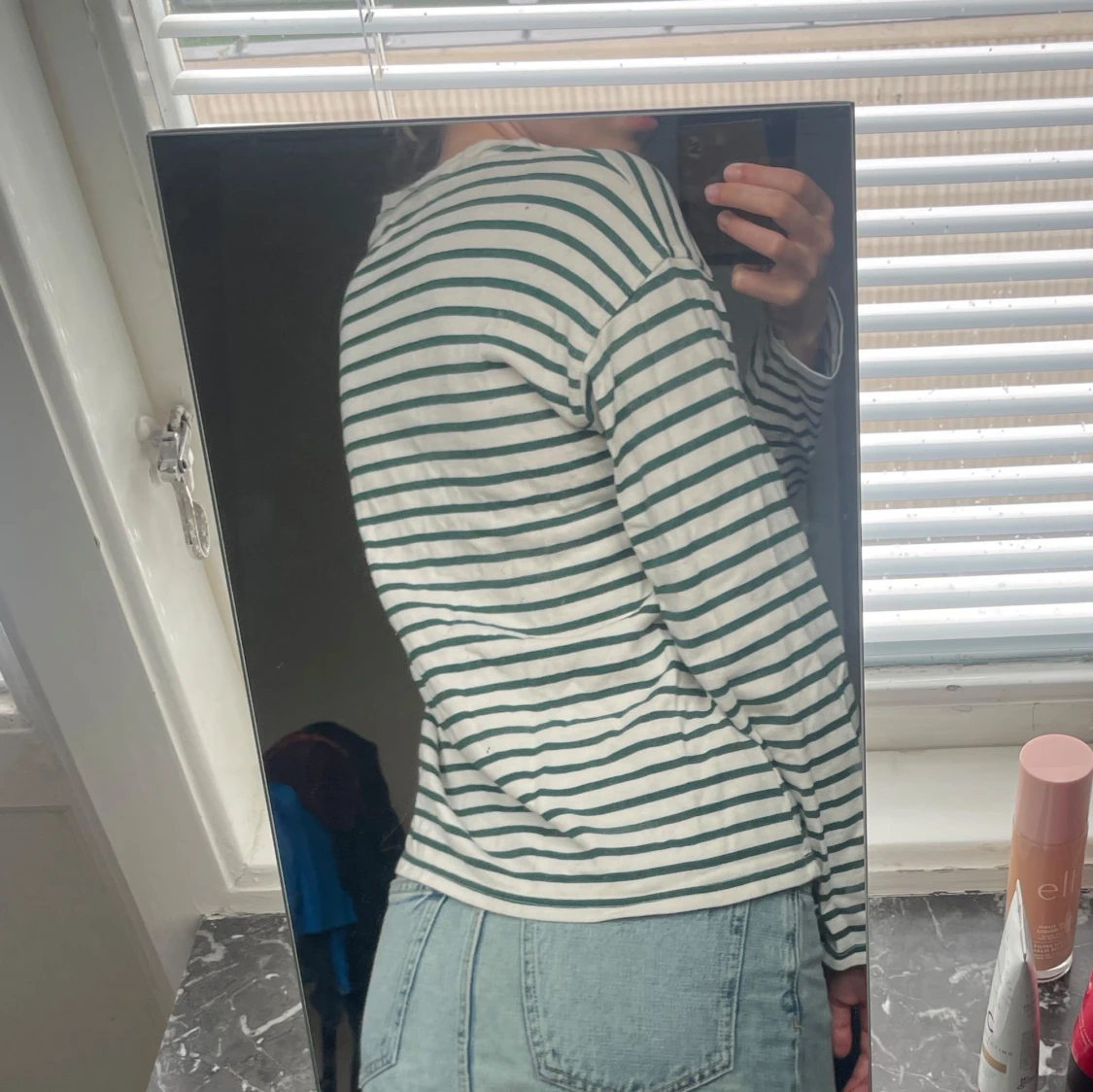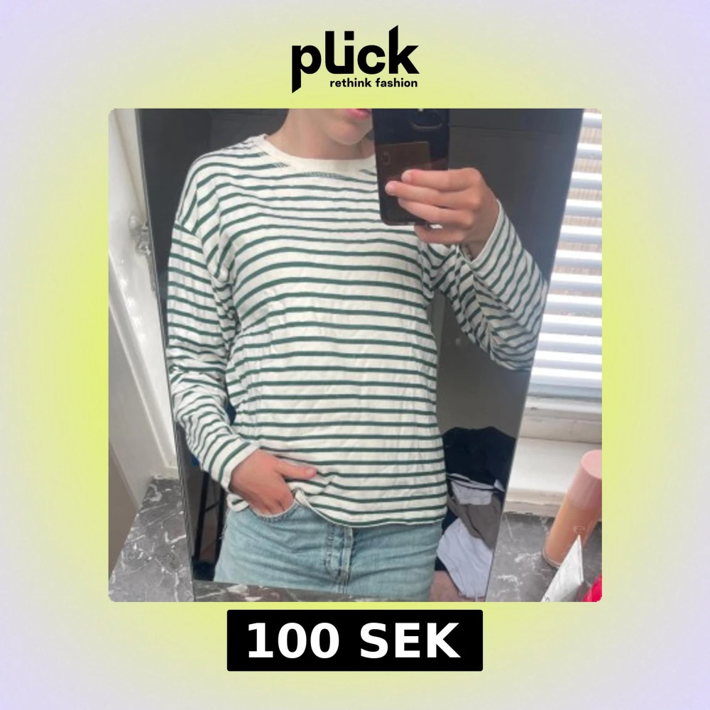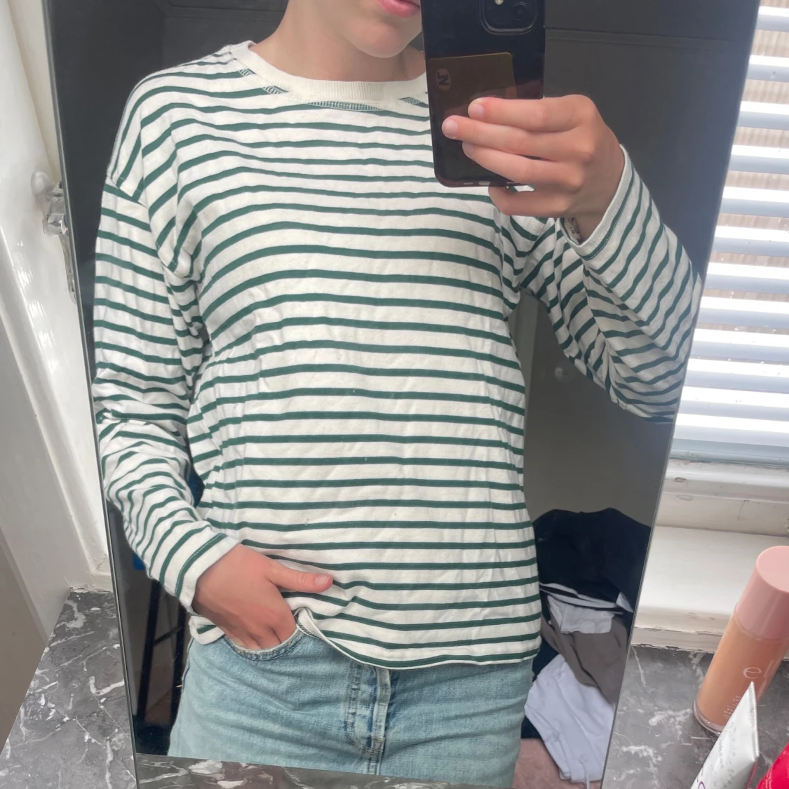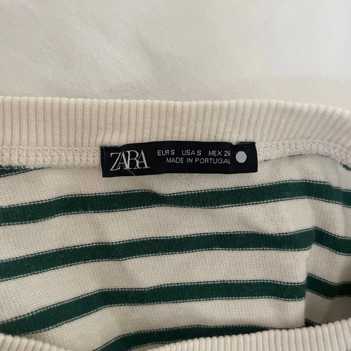 Säljer en vit långärmad tröja från Zara med gröna horisontella ränder. Tröjan har en klassisk rund halsringning och är gjord i mjuk bomull. Använd fåtal gånger💞💞