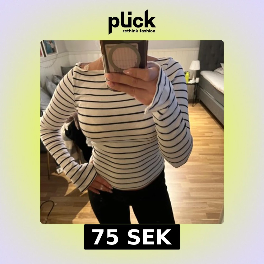 Vit och marinblå randig långärmad tröja från Gina Tricot. Tröjan har en tight passform, rund halsringning och långa ärmar med slit. Använt 2 gånger och sen tvättad💗